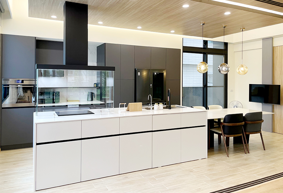 經設計總監陳先生專業設計,設計出符合業主需求、不僅是開放式廚房,洗、切、炒全部都在中島,尤其是熱炒區將油煙完全掌控,全方位完整機能、無死角的開放又能照顧老人、幼兒及可以看到電視,加上許多巧思更是進口廚具無法做到的CP值最高的MIT廚具,完全符合業主的期許。