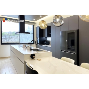 主要建材:西班牙ALRIC瓷釉烤漆門板、矽鋼石英石