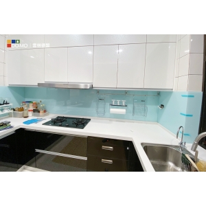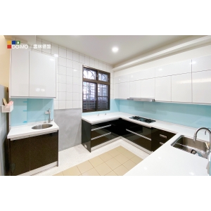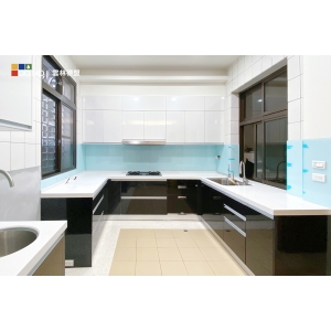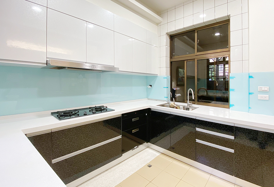 主要建材:闊石石英石檯面、強化玻璃ㄇ形包柱、歐洲粒片門板、鋁擠型手把