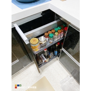 下櫃櫃體配置轉角小怪物、側架及抽屜拉籃等,方便收納及發揮最大機能性,營造清爽舒適的料理空間。