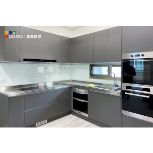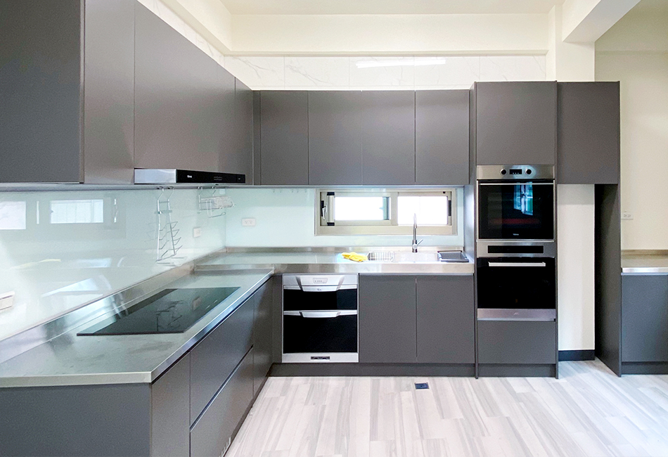 主要建材:不鏽鋼檯面、霧面鋼烤六面封、Amica大雙口IH感應爐、TEKA 烤箱、C行崁把設計