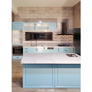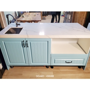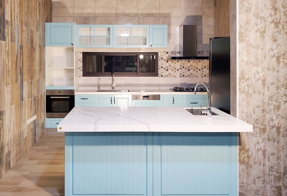 主要建材:高壓造型門板、奧地利BLUM緩衝後鈕、石英石、三邊籃、側拉籃、下櫃不鏽鋼