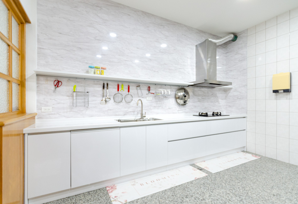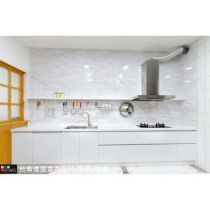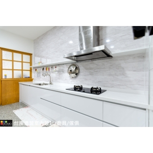 以純白和大理石紋揉合出簡單輕盈的空間,牆面結合層板和掛勾,讓在拿取用具或調味罐時能更順手,檯面使用了容易清潔的板材,使廚房空間能一直保持乾淨舒適,構築輕鬆無壓的料理日常。