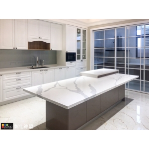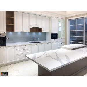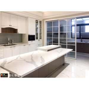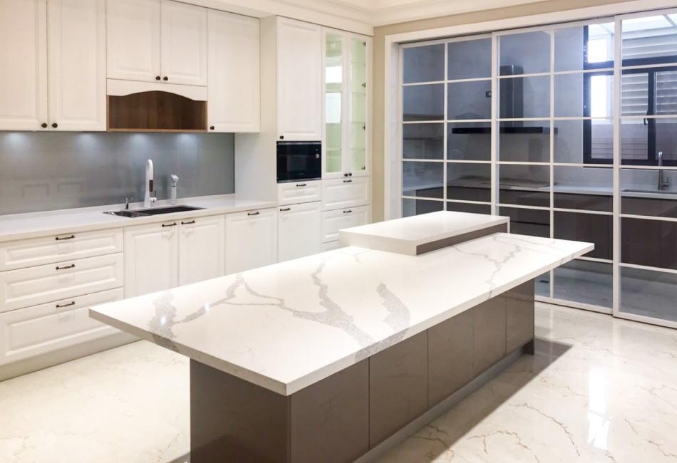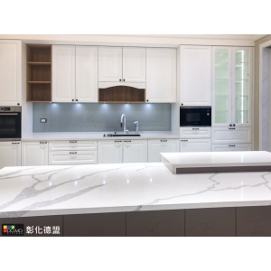 主要建材:台面大紋路石英石、門板實木紅椽木刷白、Blum 五金配件、進口花崗石水槽、Bosch 洗碗機、Bosch 蒸烤爐、Bosch 微波燒烤爐