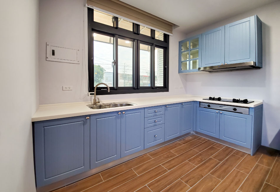 而收納櫃的部分,上櫃和下櫃的線板分別使用了柔和的淡藍和水藍色,賦予空間色彩層次感;內櫃跟五金配件因為業主父母的堅持,所以全部都選用了不銹鋼材質,為的就是希望房子能歷久彌新新。