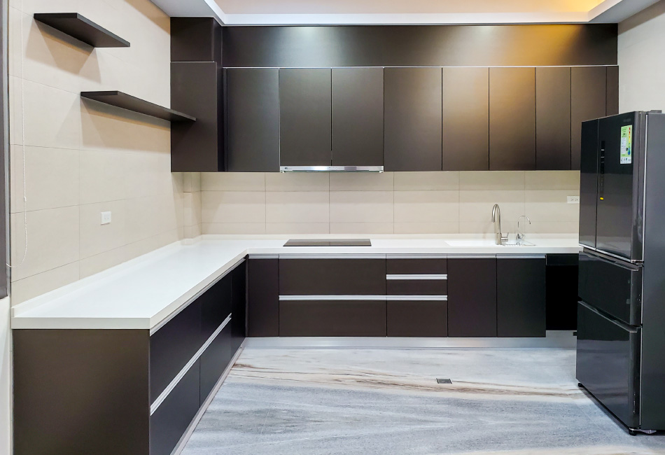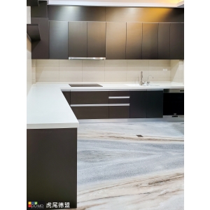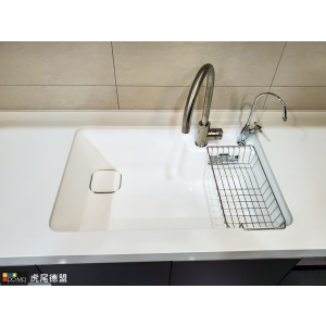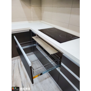 主要建材:石英石檯面、高琪鈦金門板、不鏽鋼桶身、不鏽鋼緩衝絞鍊