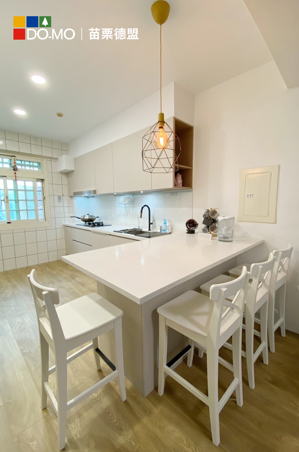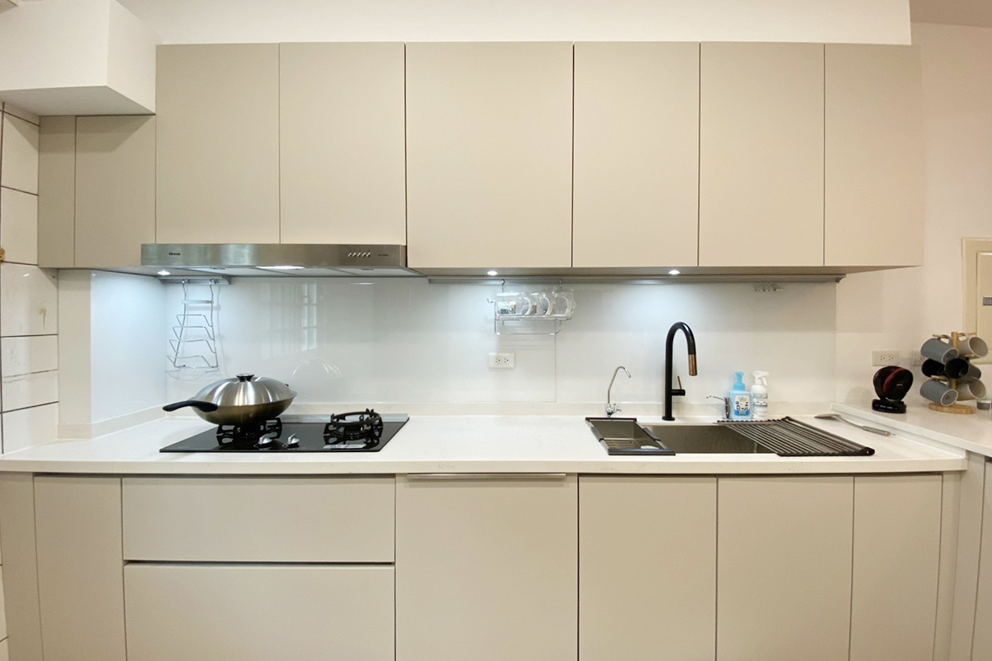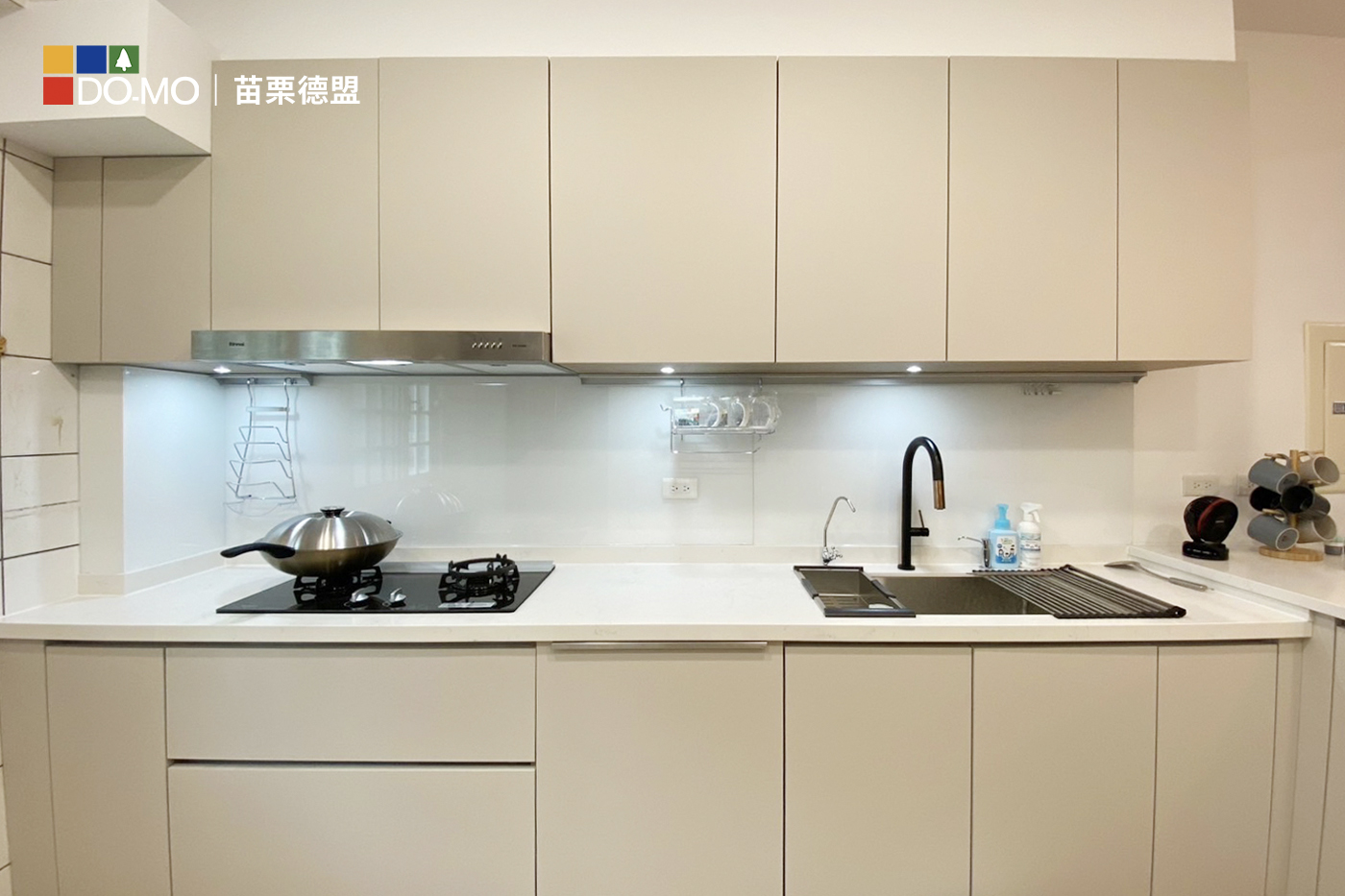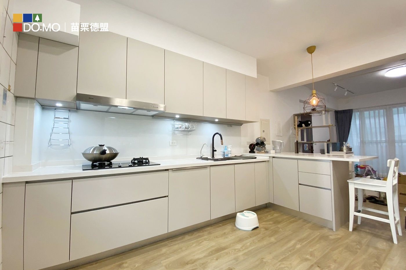 客廳旁設計開放式L型廚房,做菜時能夠與家人共同分享,也可增加物品的收納空間;門板搭配奶茶色 整體感溫柔十足。