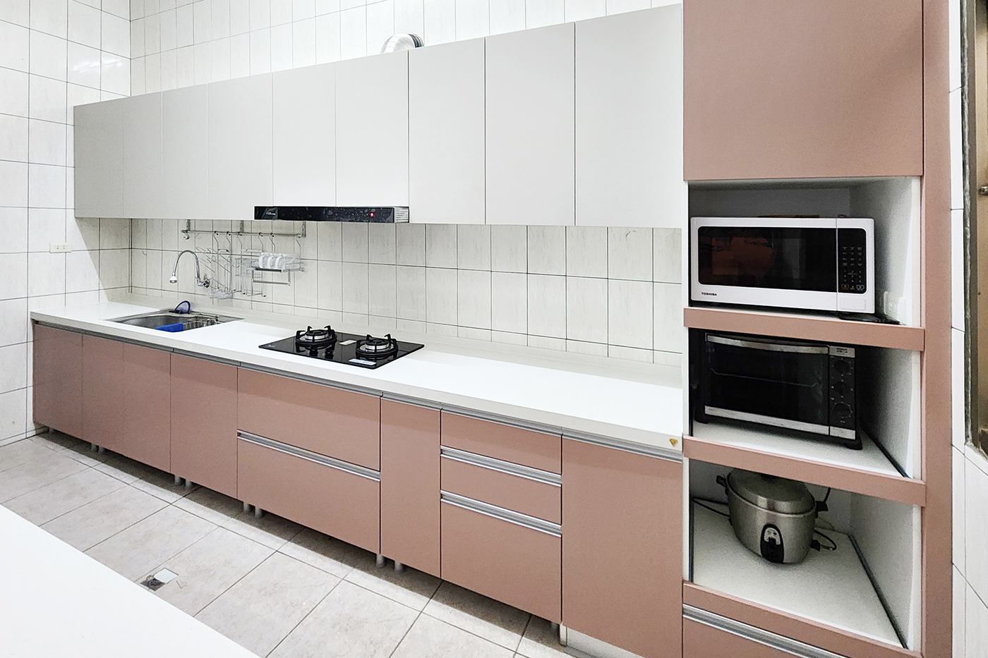 簡約的設計搭配跳色櫃體,無踢腳板做法,使廚房空間更具獨特風格。