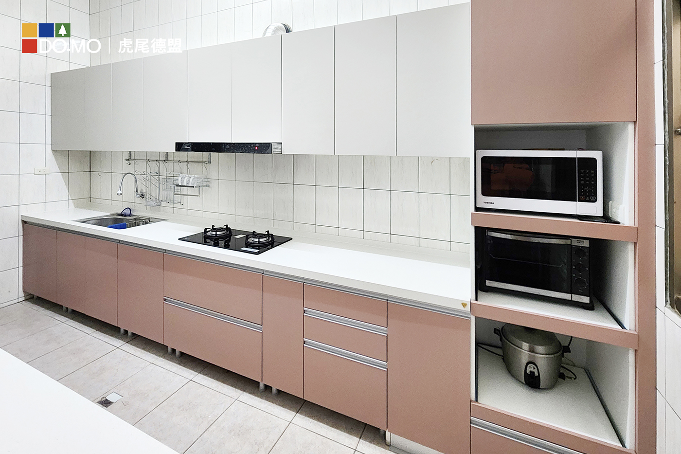 一字型廚房在烹煮時的動線及櫃體的安排,讓使用者更加順手,創造簡約現代的時尚廚房。