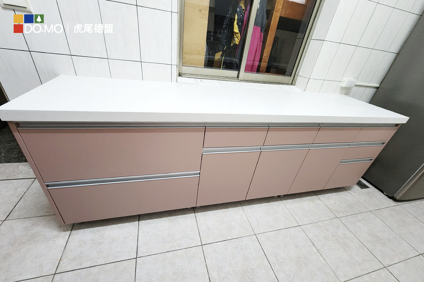主要建材:霧面硬化結晶鋼烤門板、ST繳鍊、石英石、側拉籃、平板抽、下櫃不鏽鋼