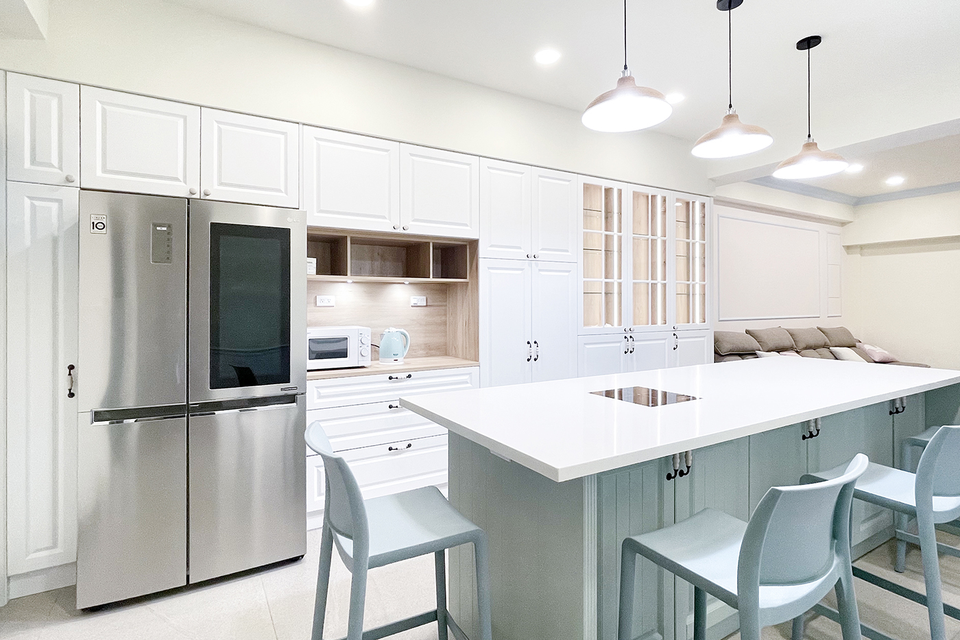 業主將廚房分料理與輕食區,希望在客廳能有個大中島,凝聚家人與親朋好友相聚。簡潔舒服的色調,搭配鄉村風設計,享受愜意的烹飪生活。