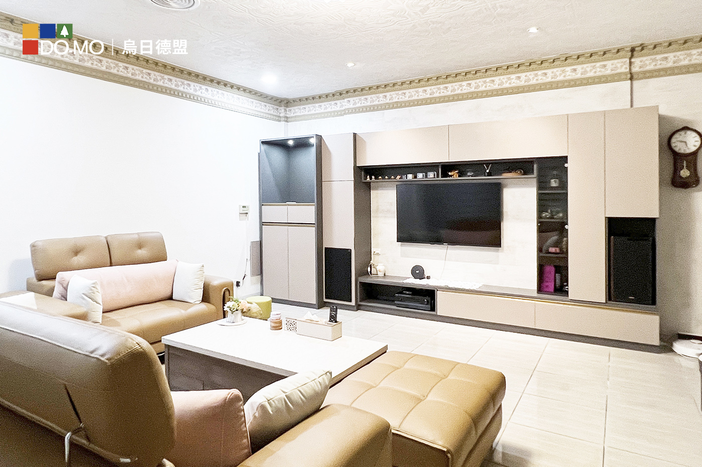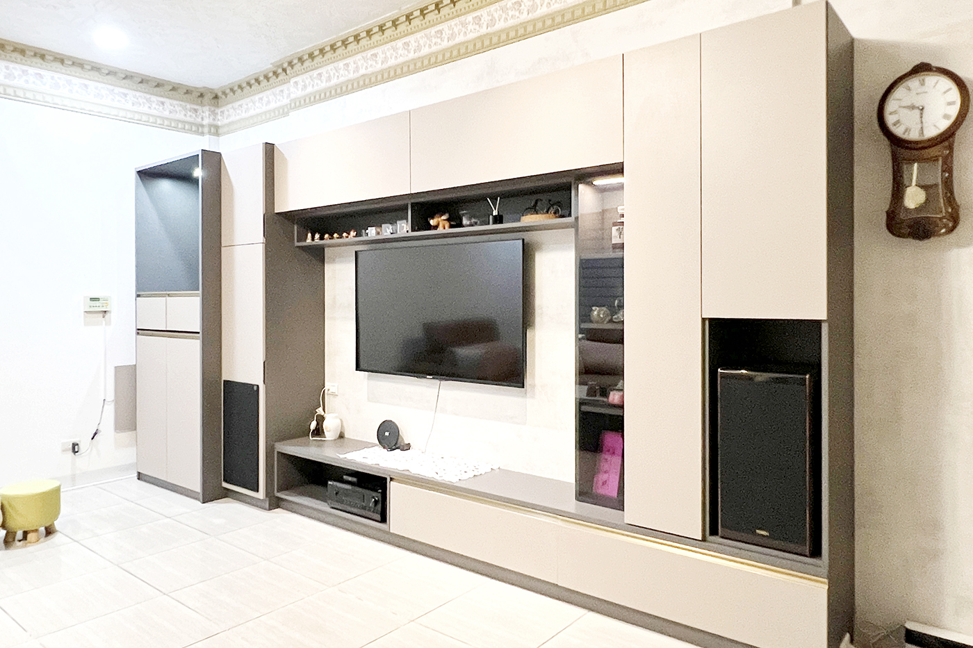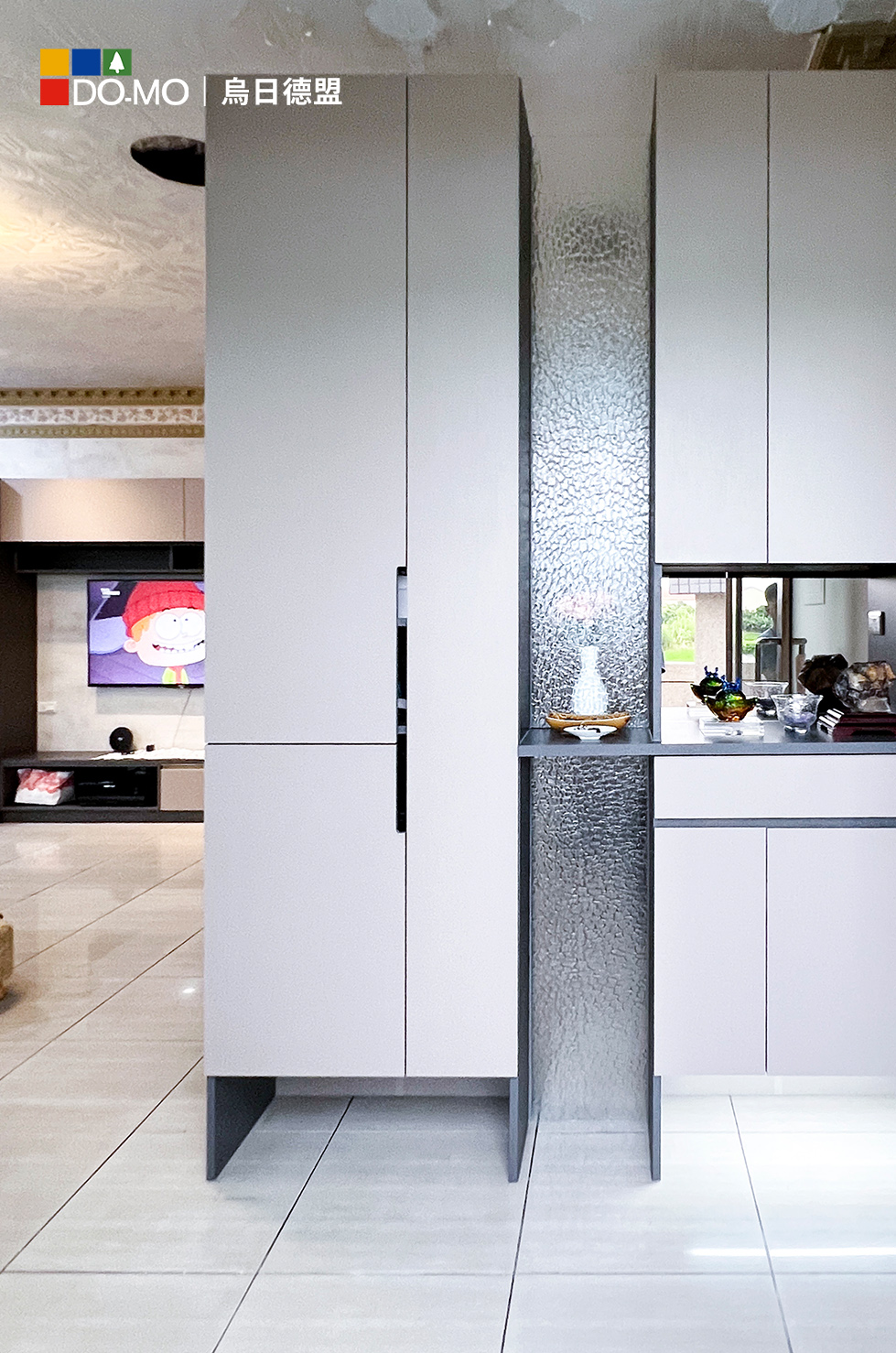使用現代風與傳統神明廳結合,打造出種類不同但可以混搭一起。 以現代感風格的電視櫃來融合神明桌,讓神明桌不失莊嚴又可以跟電視櫃毫無違和、不顯得突兀, 神明桌設計在文公尺寸上特別講究,透過俐落簡單的造型,更符合居家風格及收納功能, 讓公共廳區櫃體與家具設計呈現整體感。
