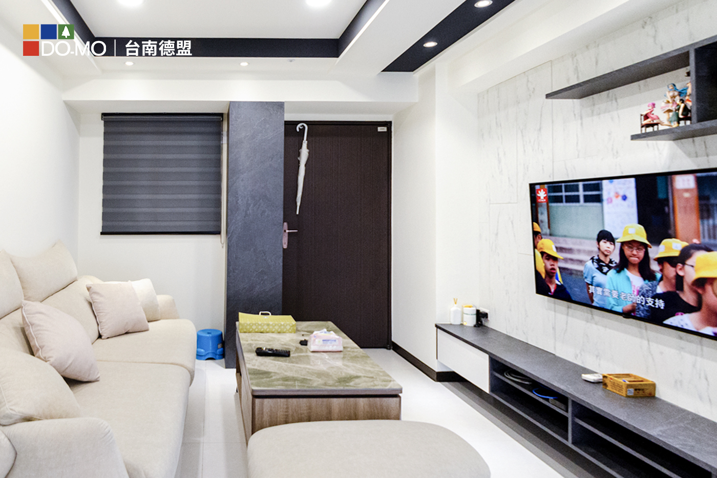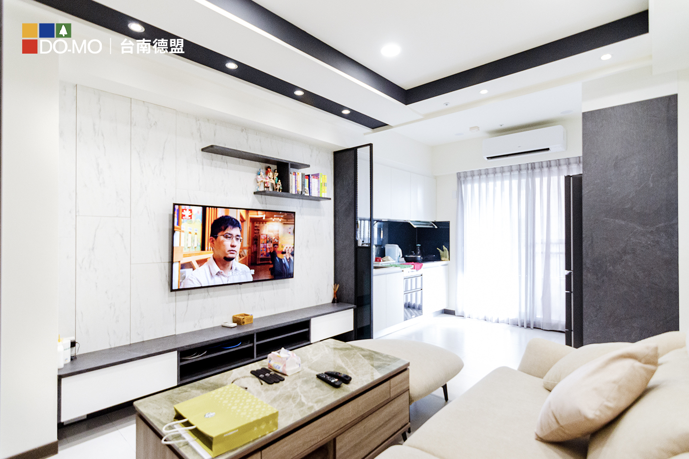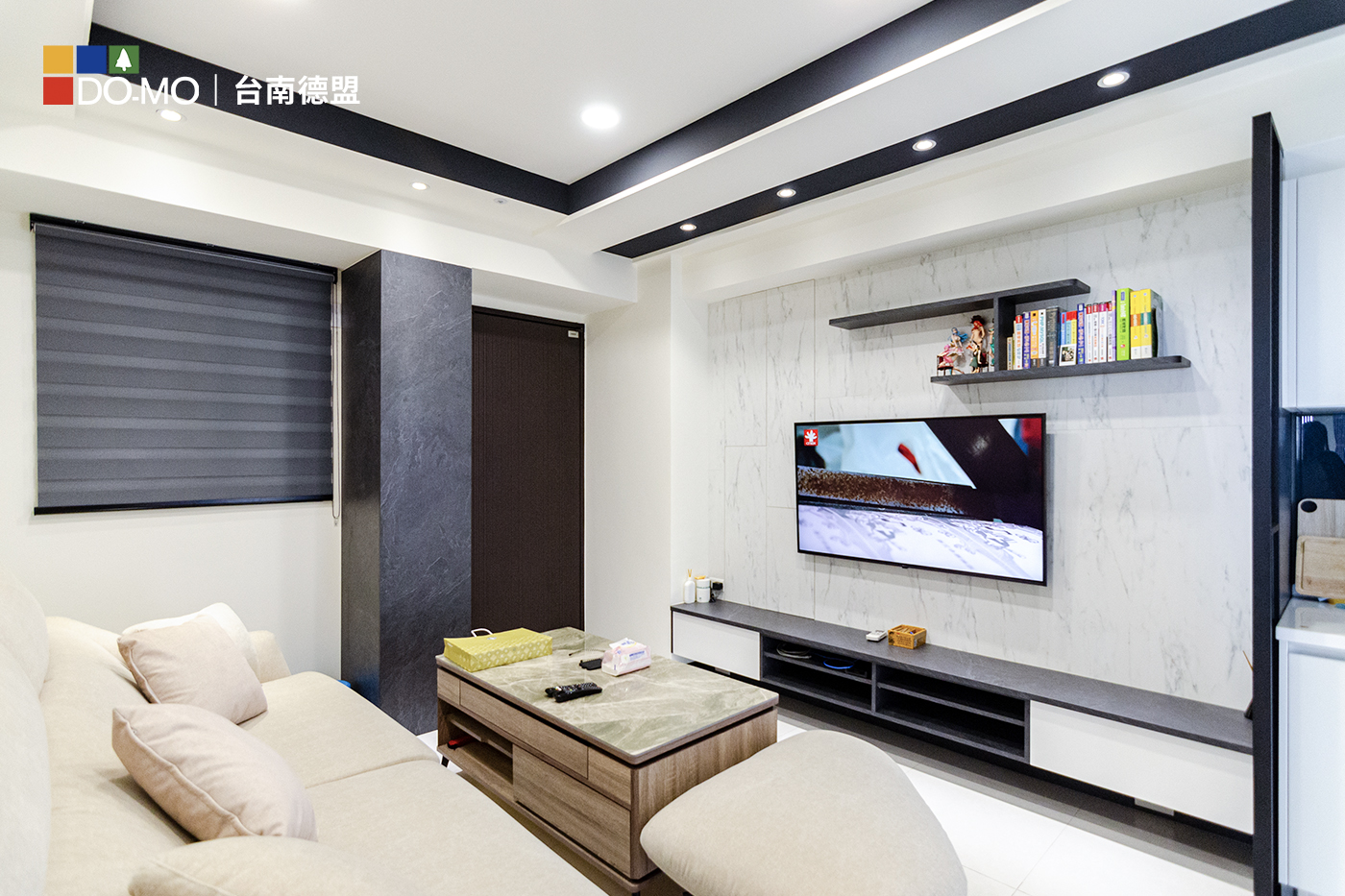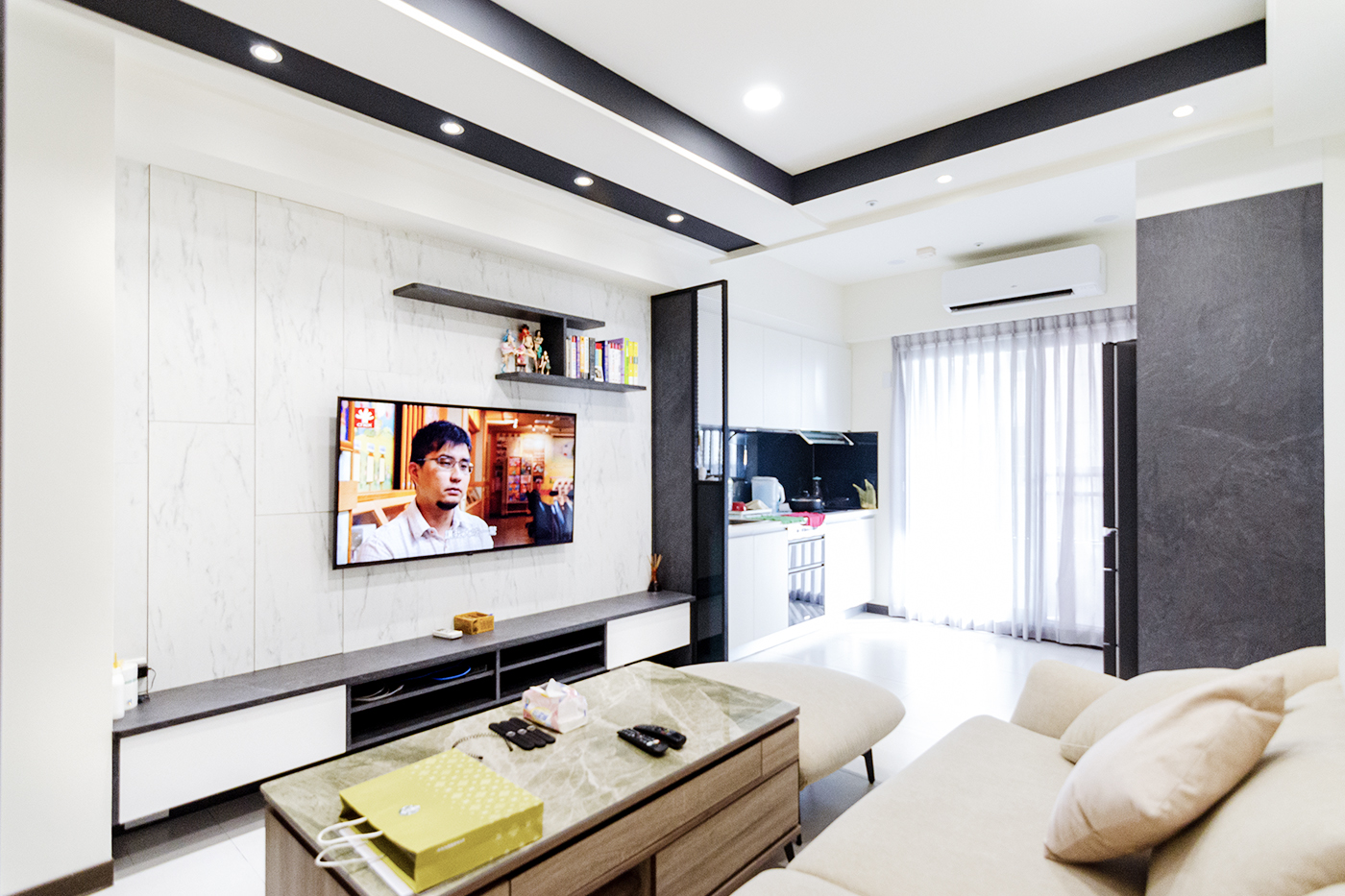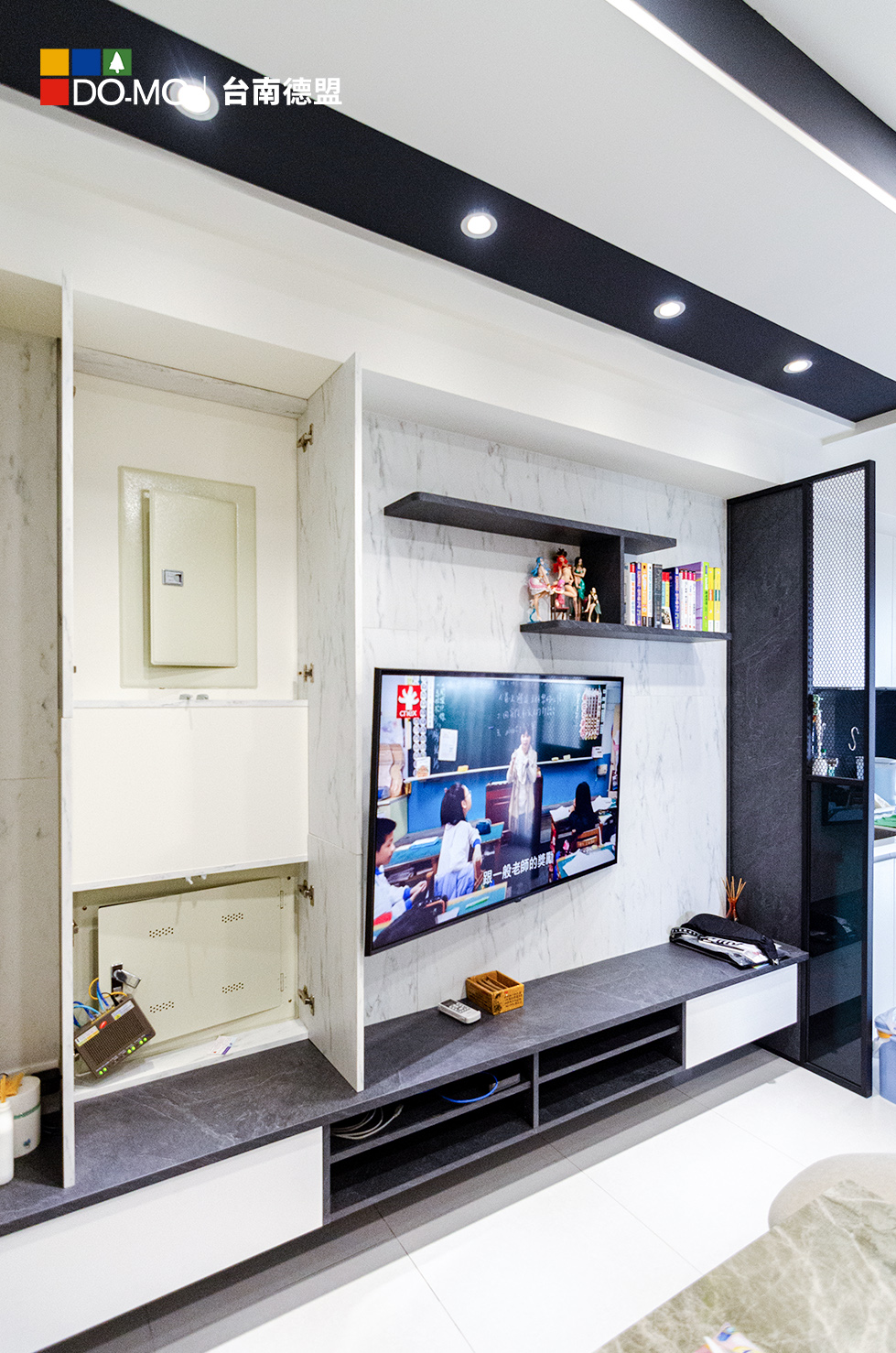 電視牆使用白色石紋的板材增添色彩層次感,並設置了層架方便擺放展示品和藏書。