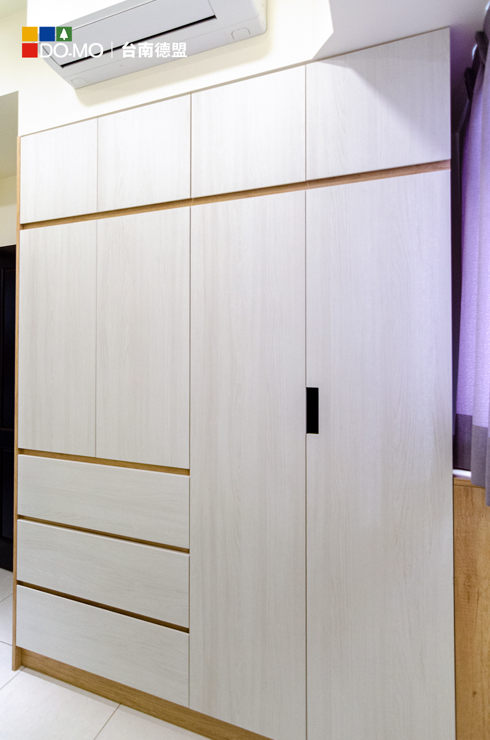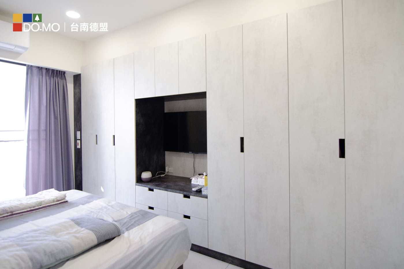 臥室延續簡約主調,規劃了整面的收納牆並兼具電視櫃功能
