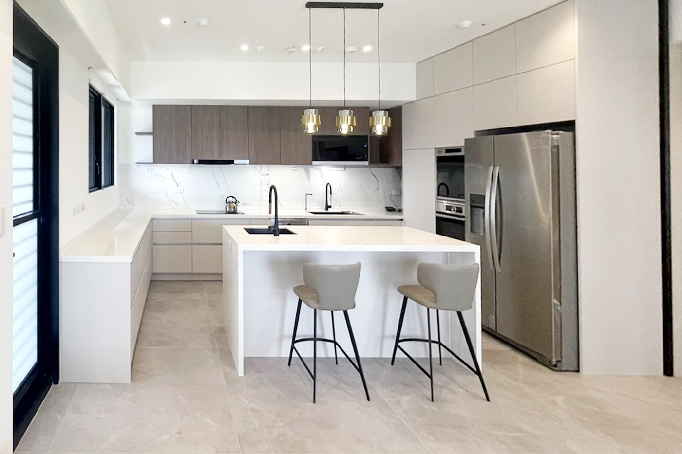 主要建材:西班牙ALRIC瓷釉烤漆門板、系統美芯板門板、檯面矽鋼石英石、櫻花獨立式抽油煙機、Electrolux三口感應爐、Miele半崁式洗碗機、喜特麗炊飯櫃、BOSCH蒸烤、櫻花吊掛烘碗機、BLANCO花崗岩水槽 、歐瓦伸縮龍頭
