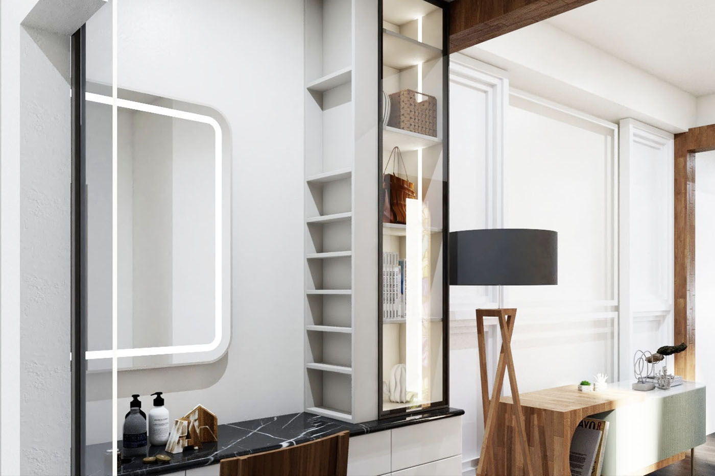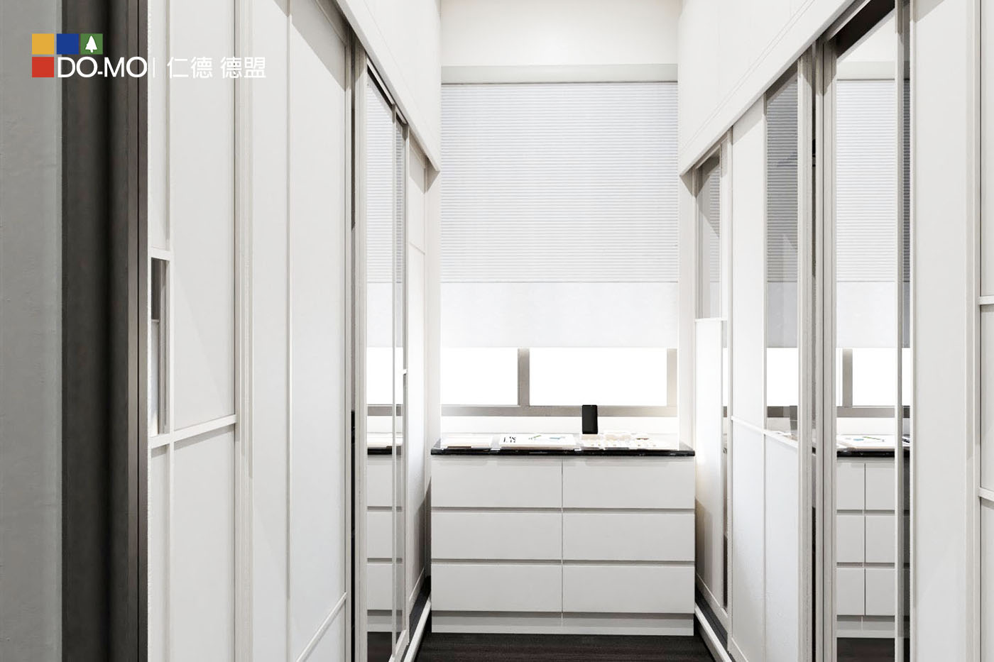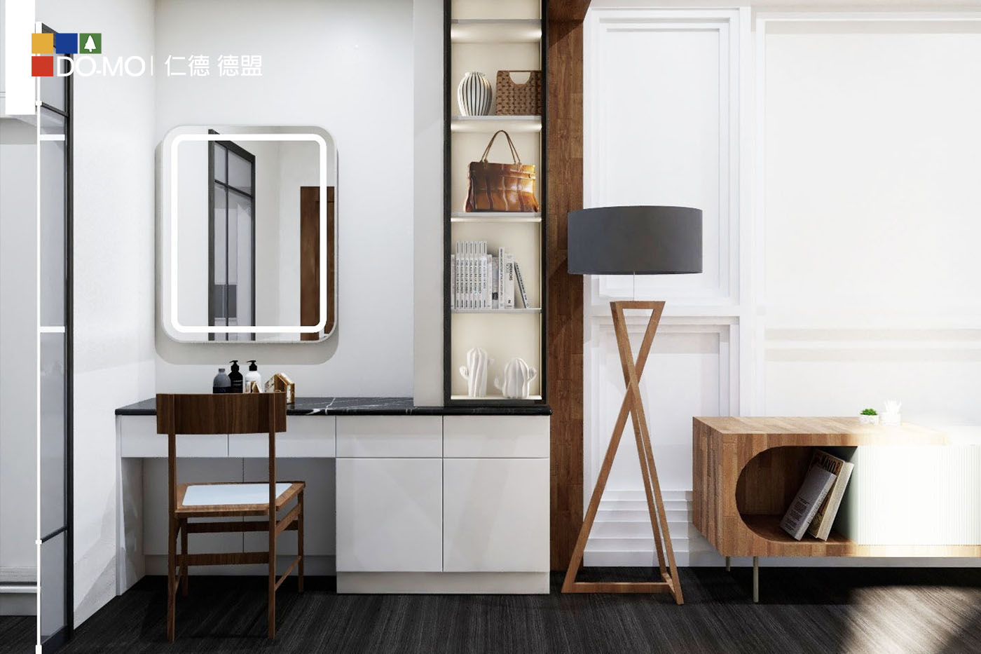 穿過廊道,是女主人的專屬化妝檯,拉開推拉門,便是能收納大量衣物的更衣室。開關流暢的滑門上局部點綴黑玻璃,半透感使櫃體降低了壓迫感。