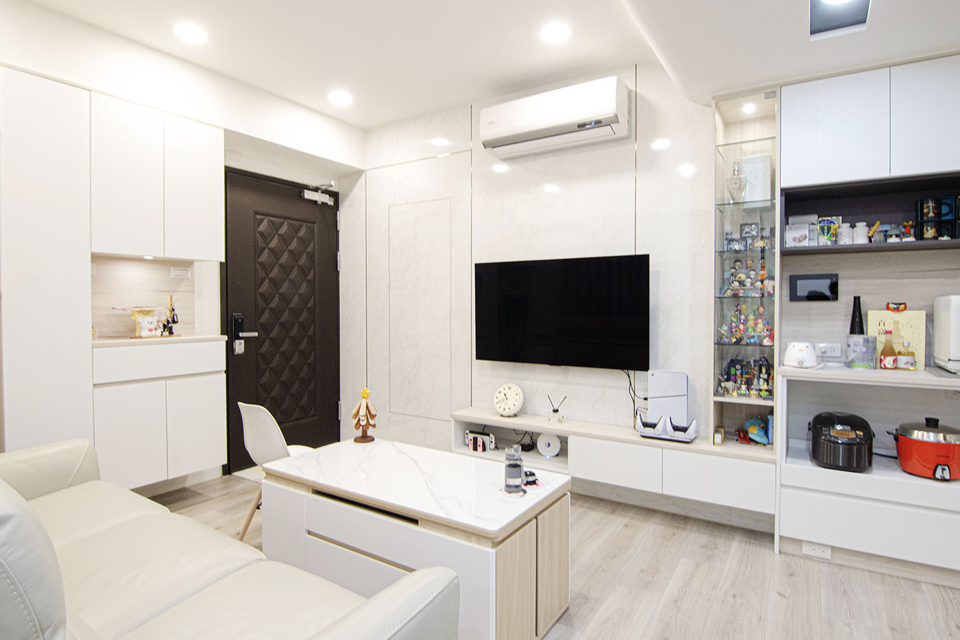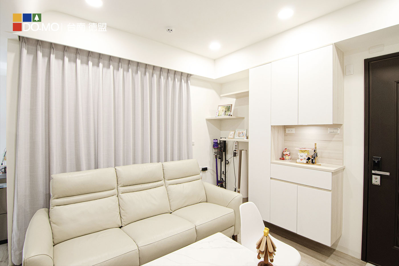 白色與自然寫意的淺白木紋搭配是日系清爽的經典配色,全白的電視牆面刻畫幾道金屬飾線,為簡潔的牆面注入質感。