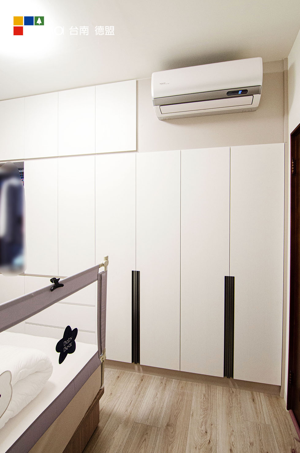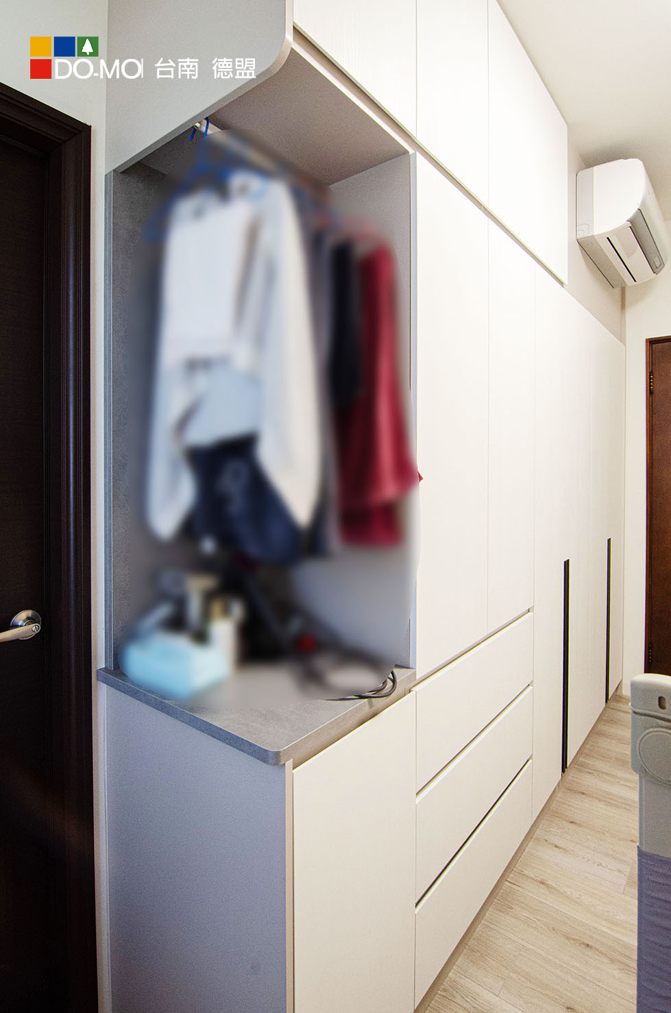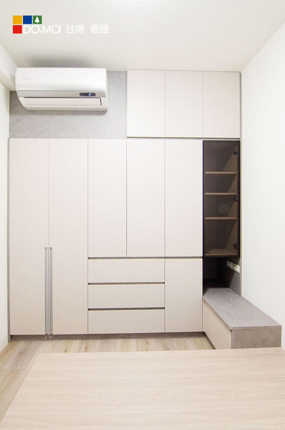 預計置放衣櫃的牆面正巧已經安裝冷氣,訂製系統櫃則能完美避開冷氣,打造完美符合業主需求的衣櫃。