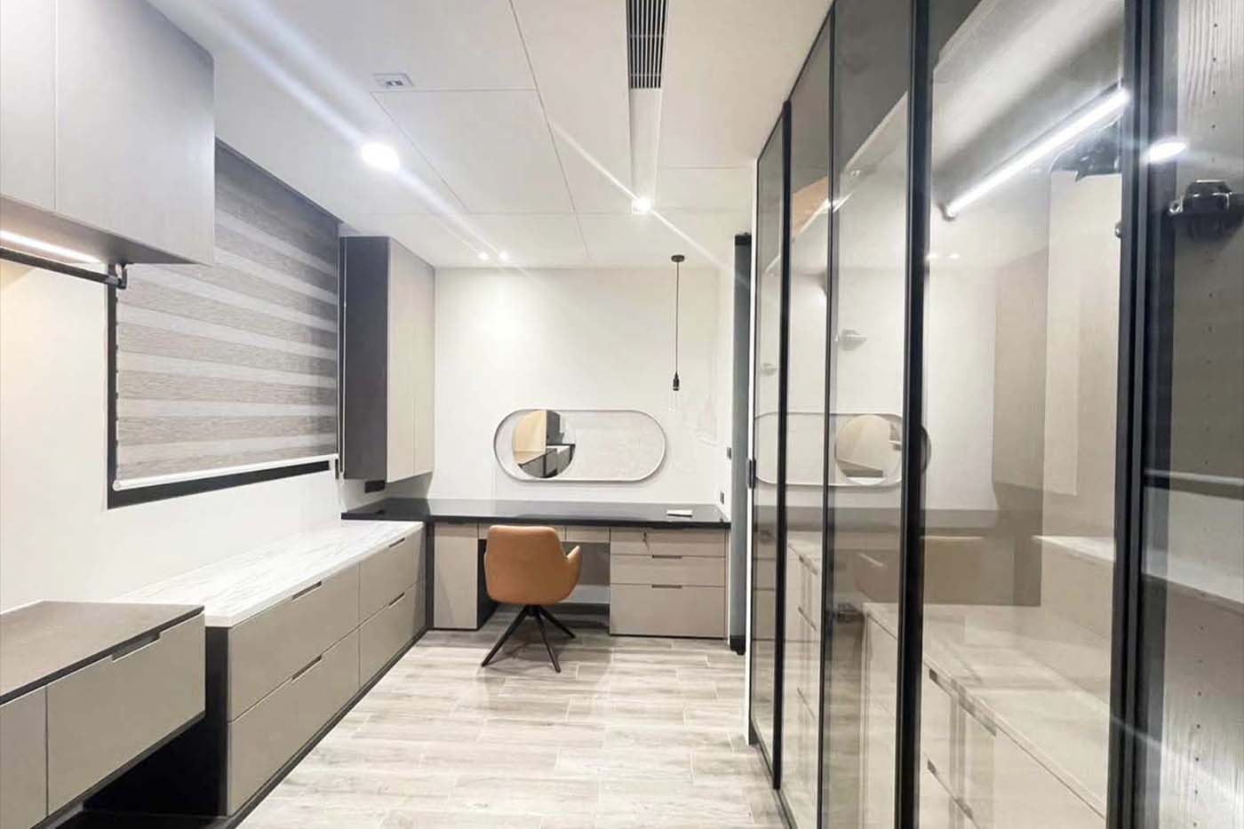 依照客戶的喜好風格,使用鐵件和坎入式燈條,並加入設計理念,將整體的開放空間展現出簡約的典雅時尚,打造出大氣的工業風主臥。