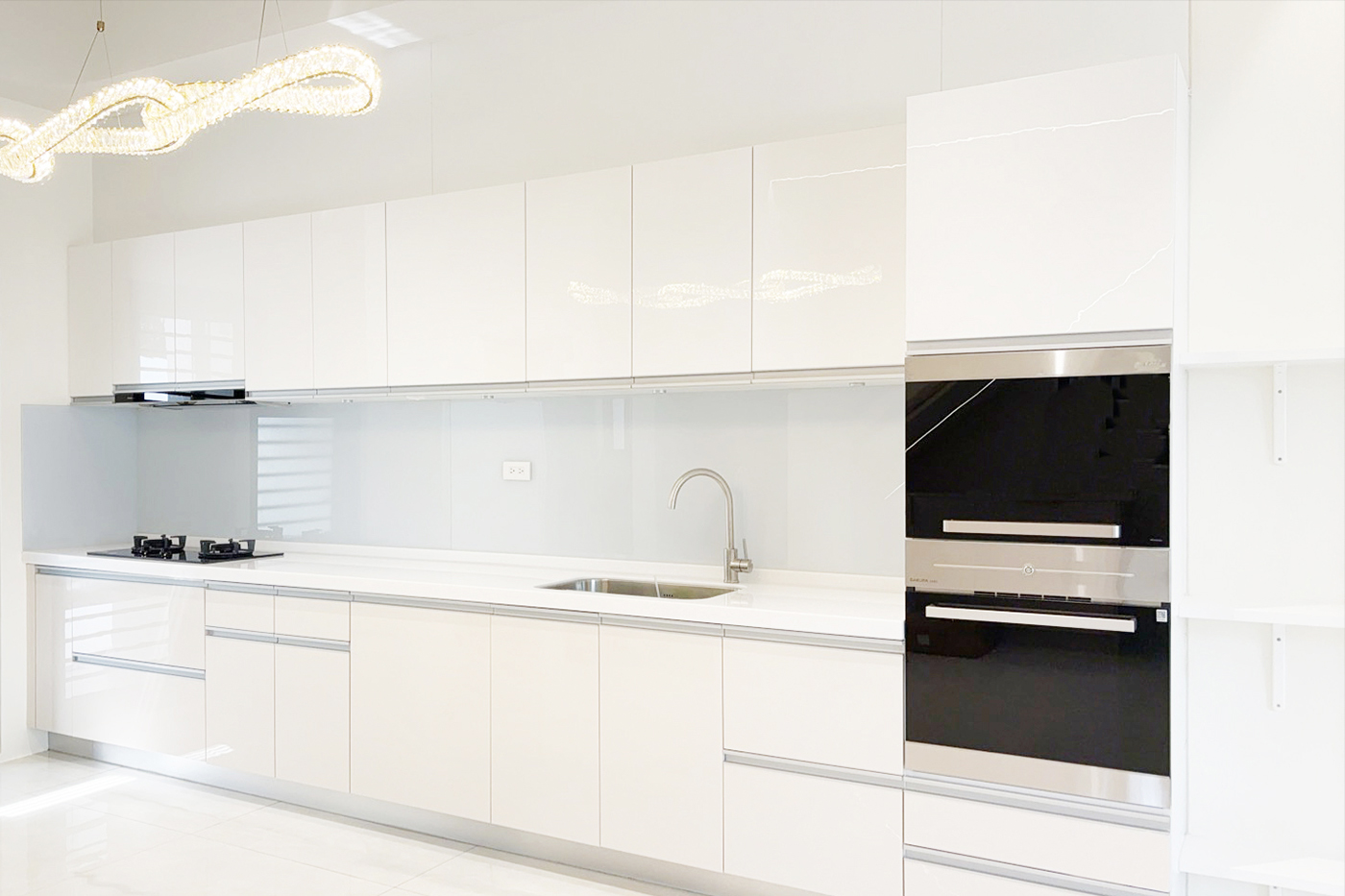 運用高光亮面櫥櫃搭配玻璃,映射出清澈明亮的光澤感,讓空間更顯寬敞明亮。
