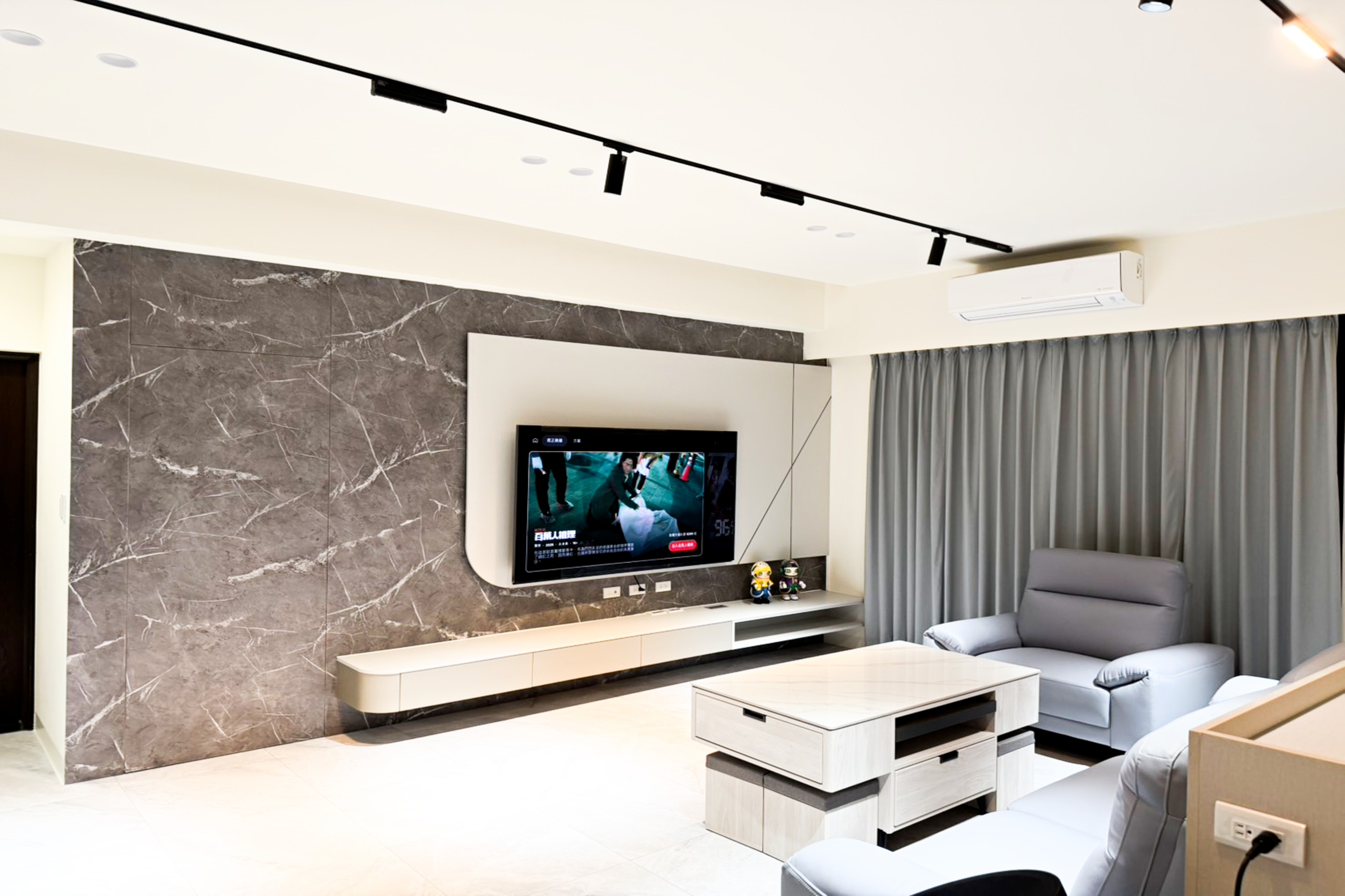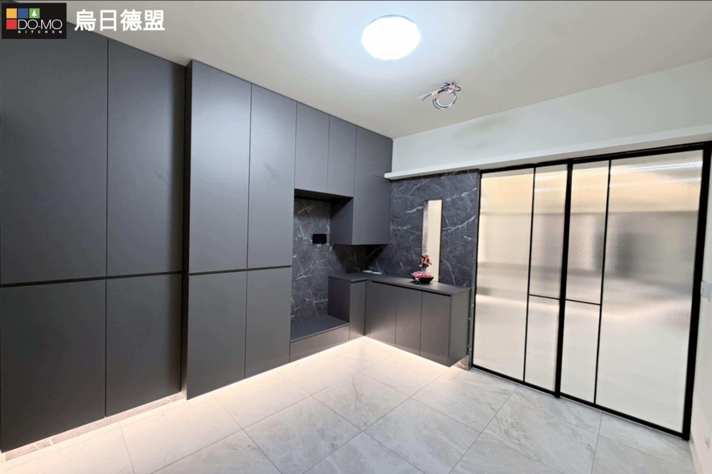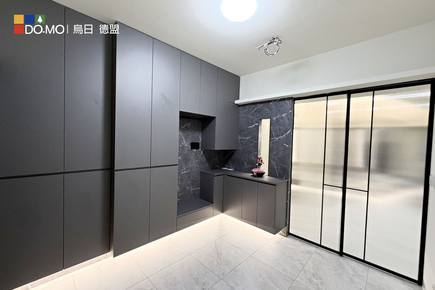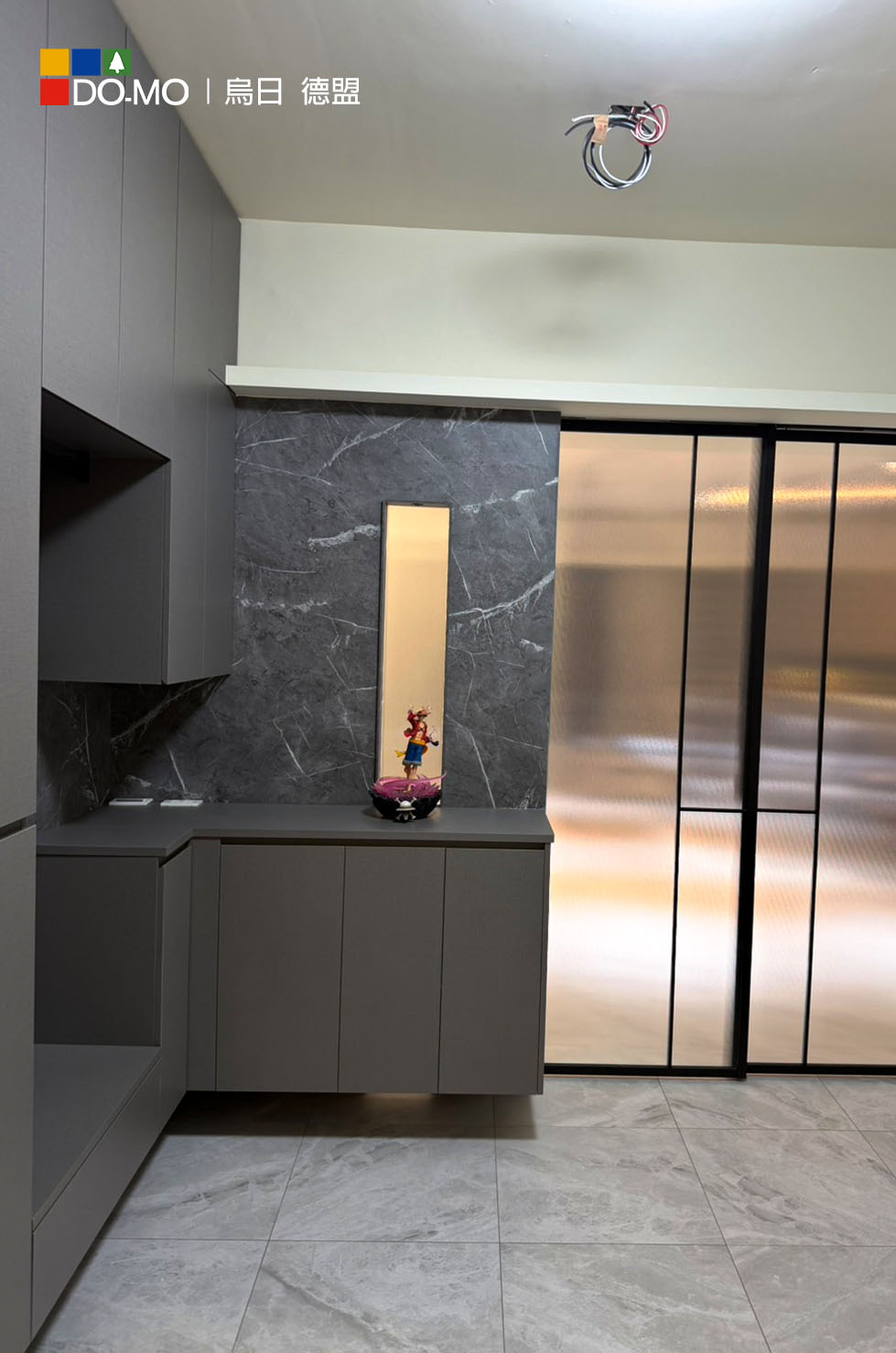 客廳運用沉穩灰調與石紋質材,營造低調優雅的空間氛圍。整體格局精心 規劃,大量隱藏式收納與系統櫃設計,大幅提升收納機能與整潔度。 兼顧美感與實用性,打造舒適、寬敞且富有質感的理想居所。 玄關 利用挑高鞋櫃將樑隱藏並增加收納量,以玻璃及燈光讓整體氛圍更多元。