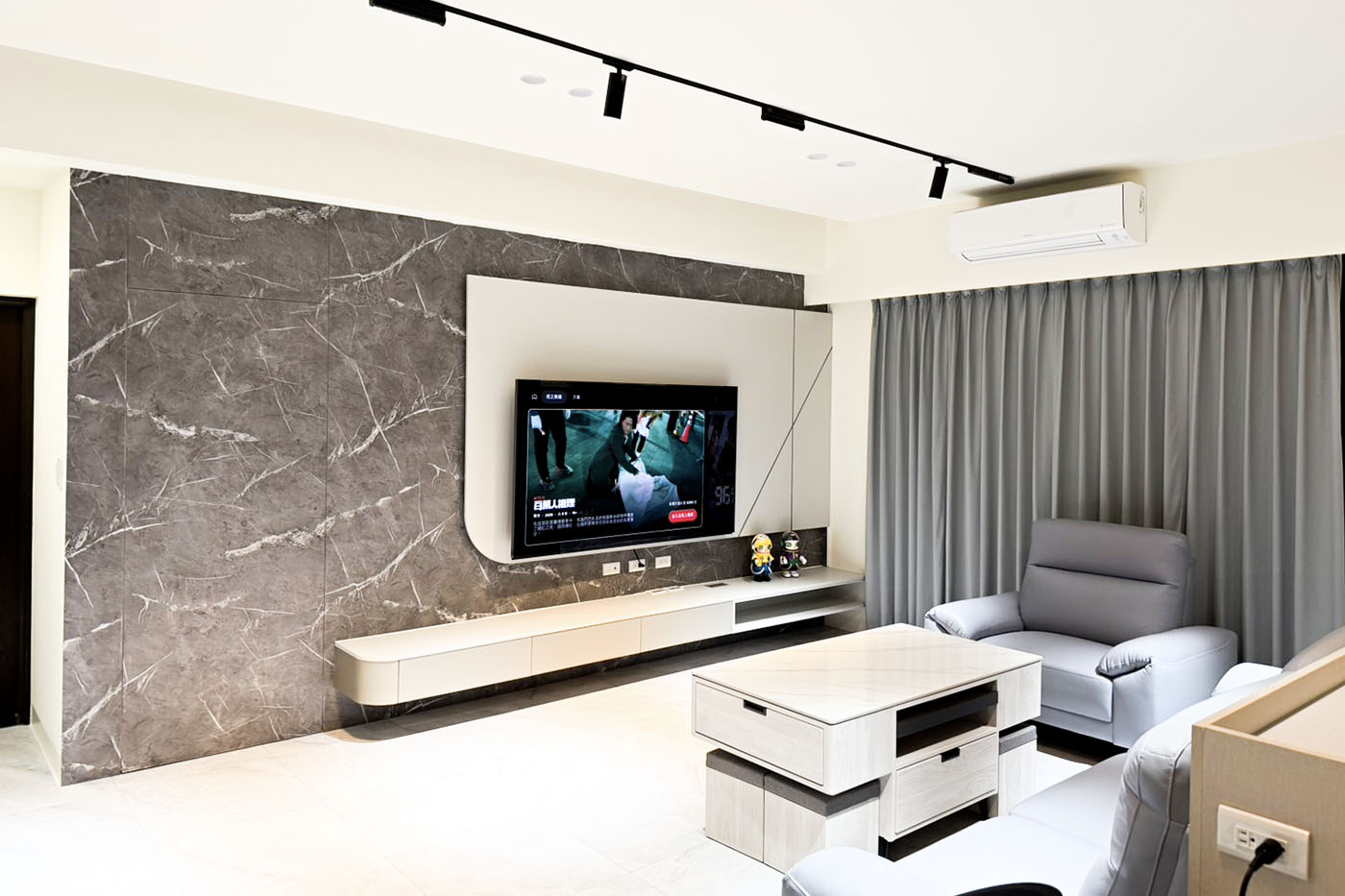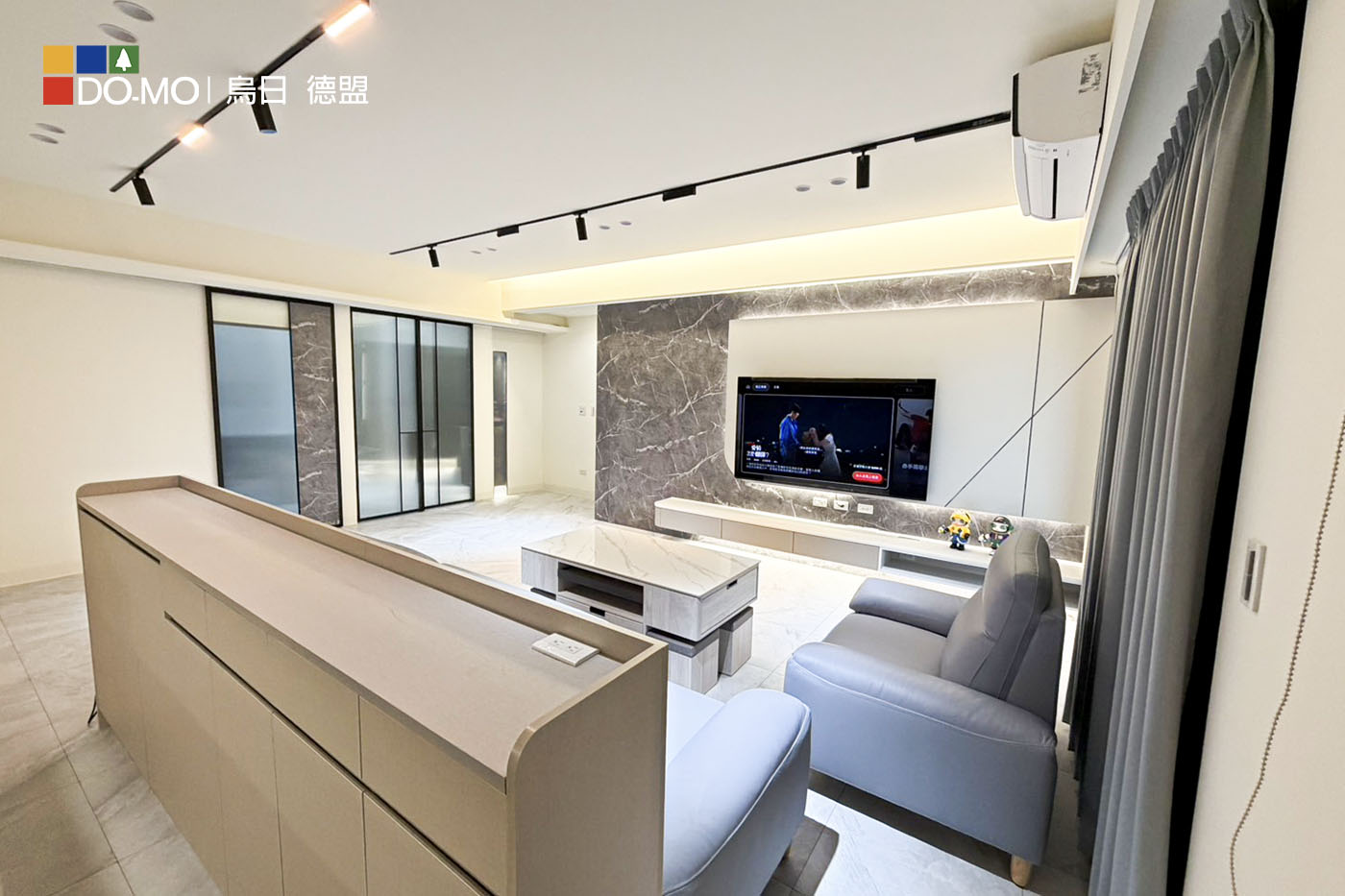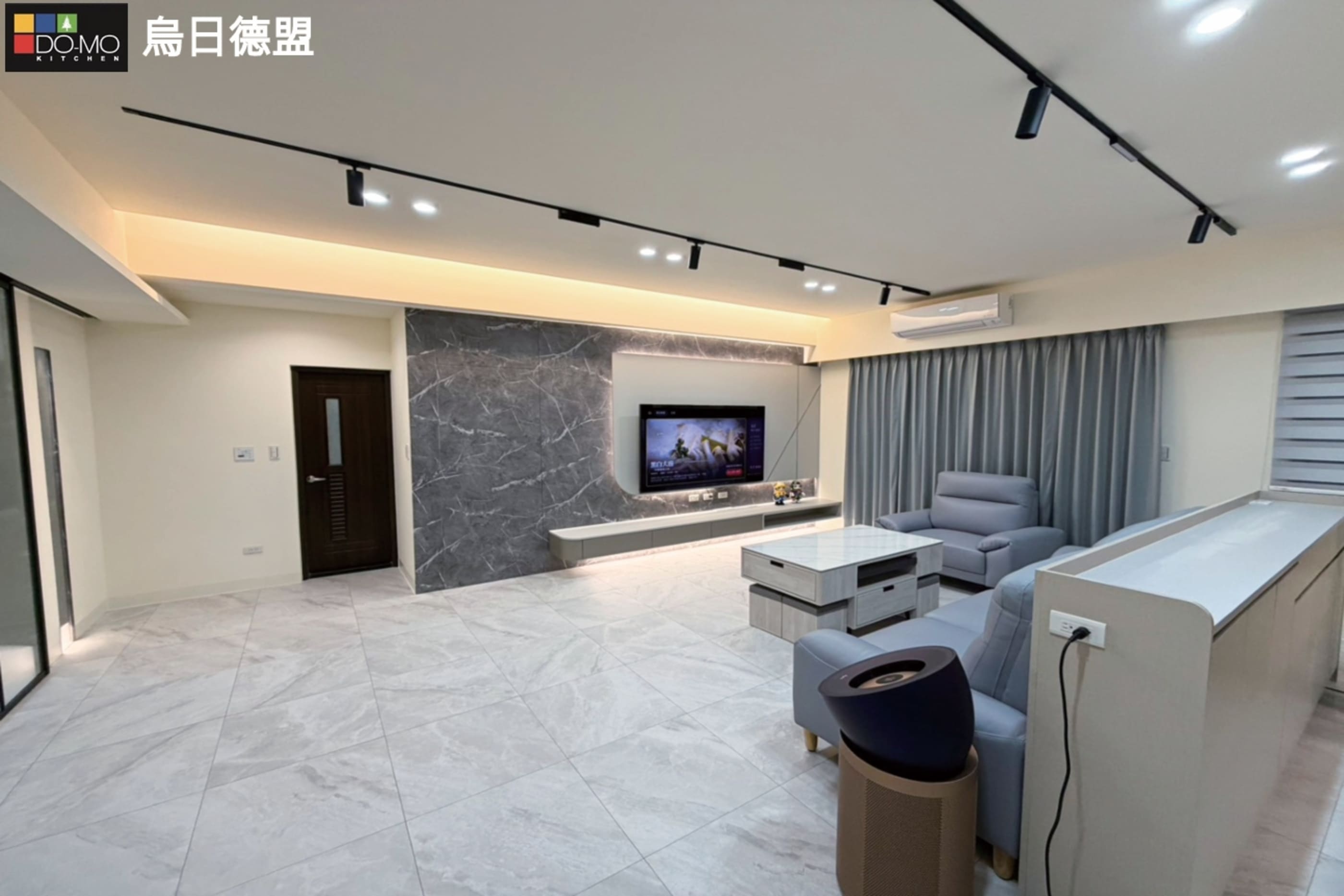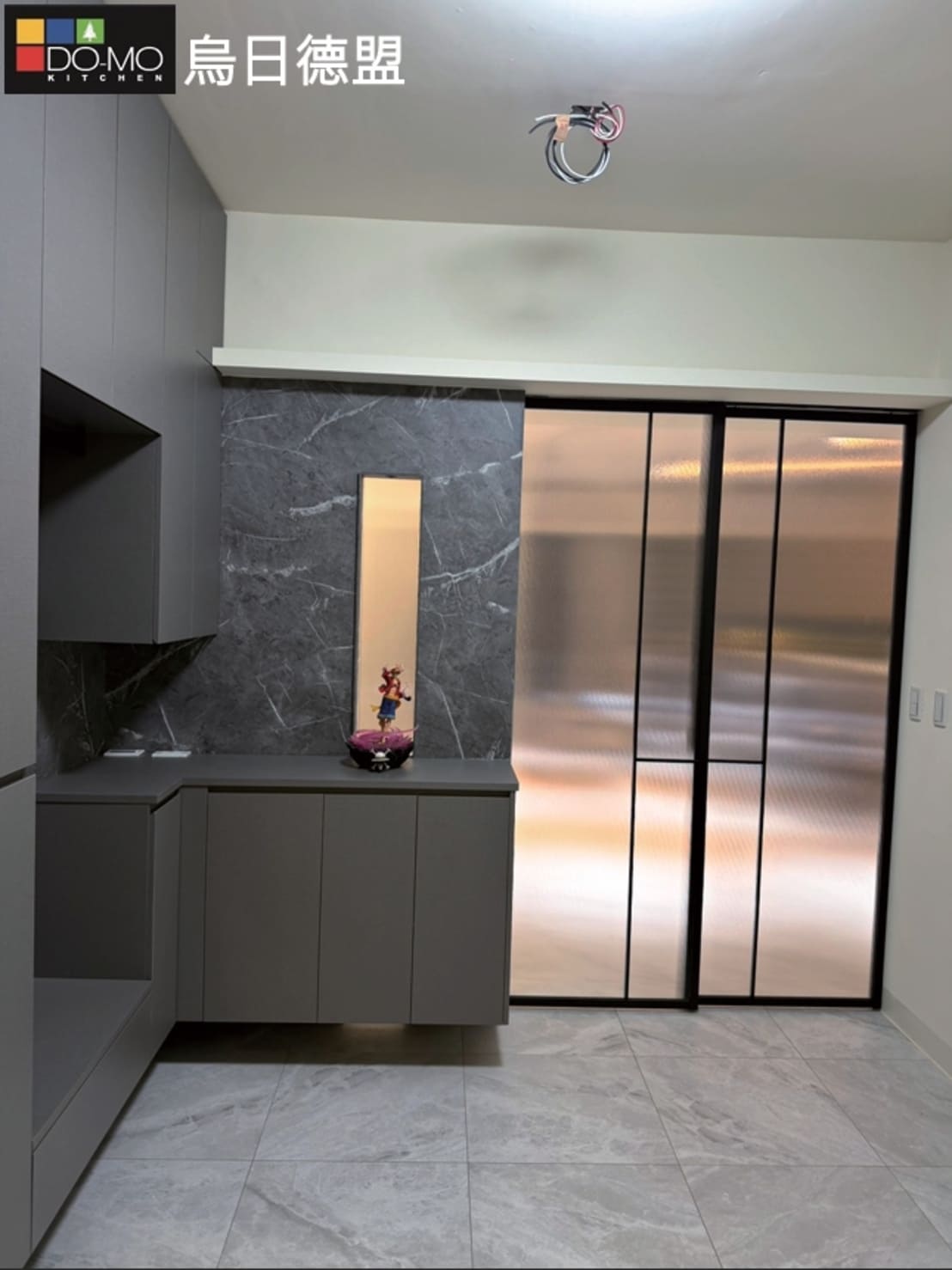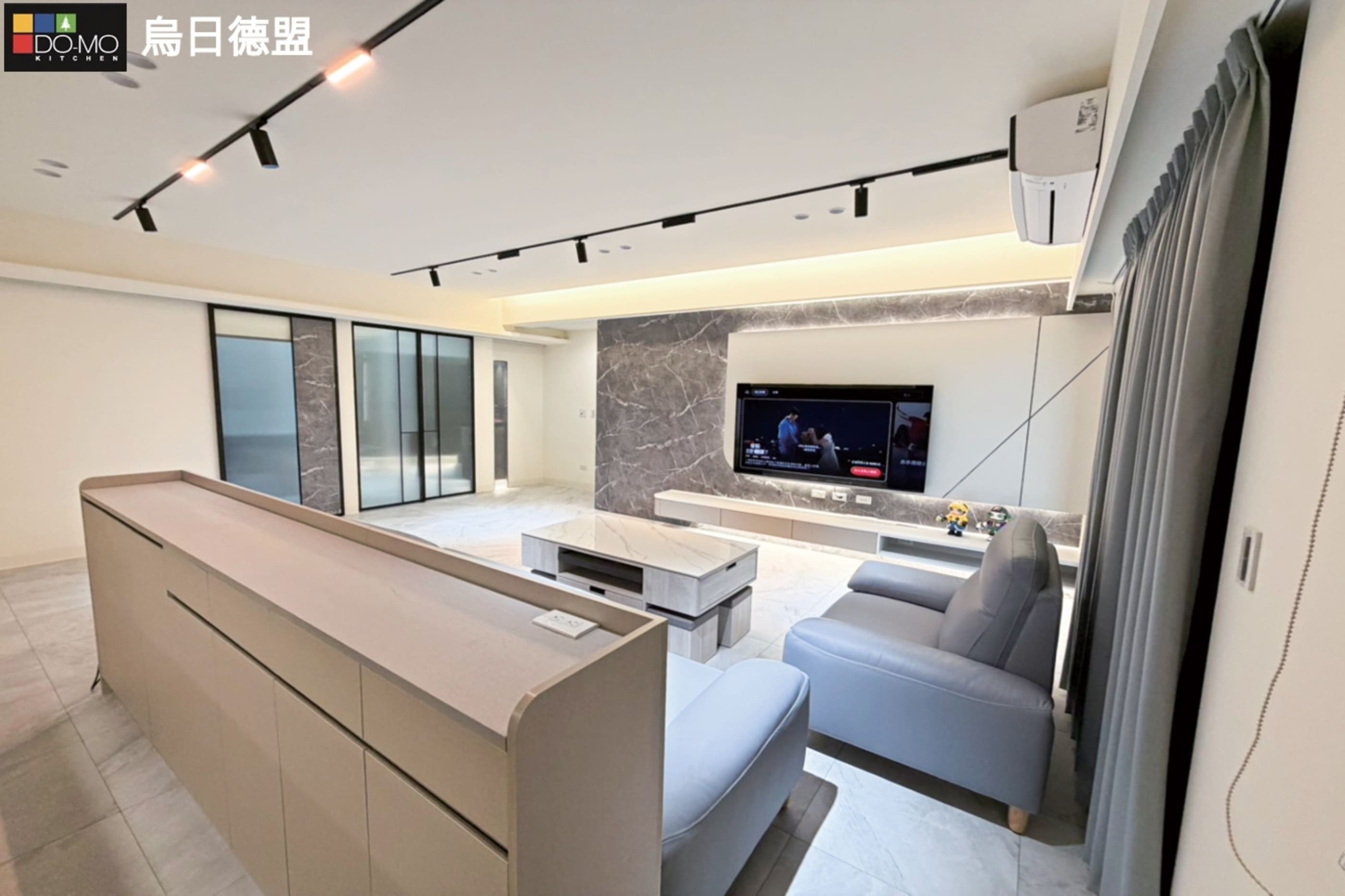 客廳運用沉穩灰調與石紋質材,營造低調優雅的空間氛圍。整體格局精心 規劃,大量隱藏式收納與系統櫃設計,大幅提升收納機能與整潔度。 兼顧美感與實用性,打造舒適、寬敞且富有質感的理想居所。 玄關 利用挑高鞋櫃將樑隱藏並增加收納量,以玻璃及燈光讓整體氛圍更多元。