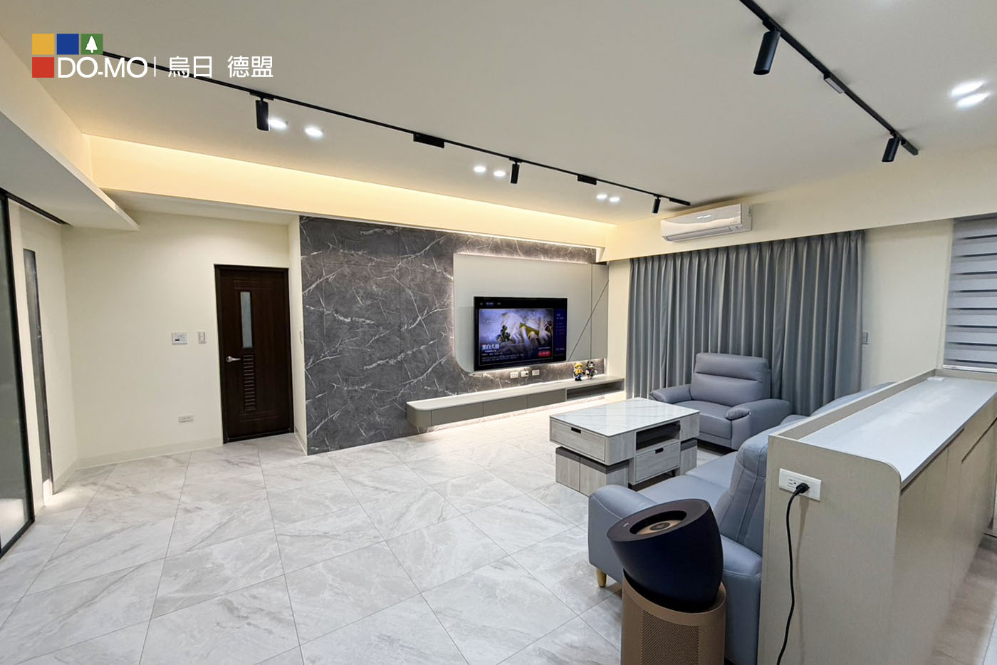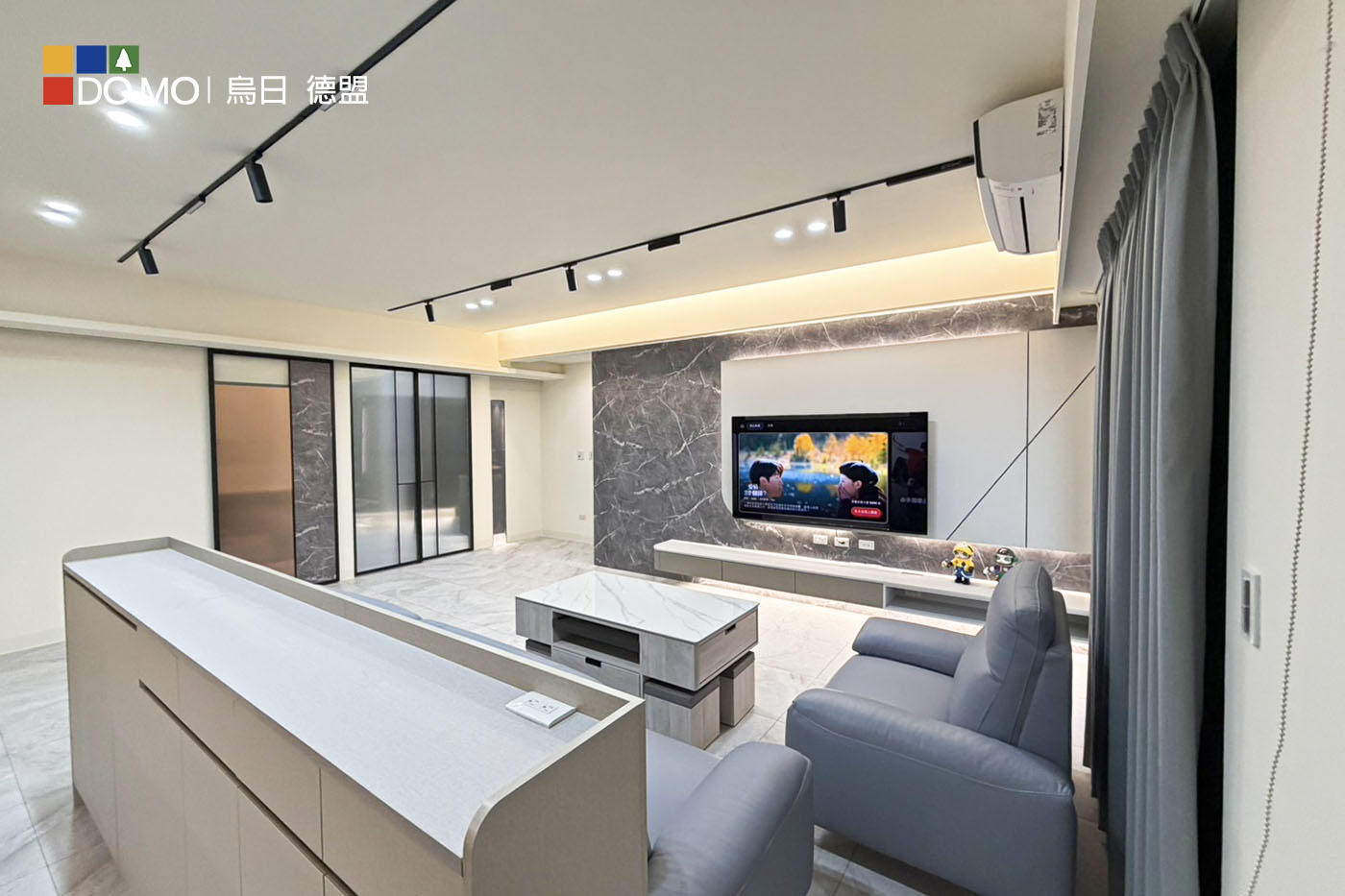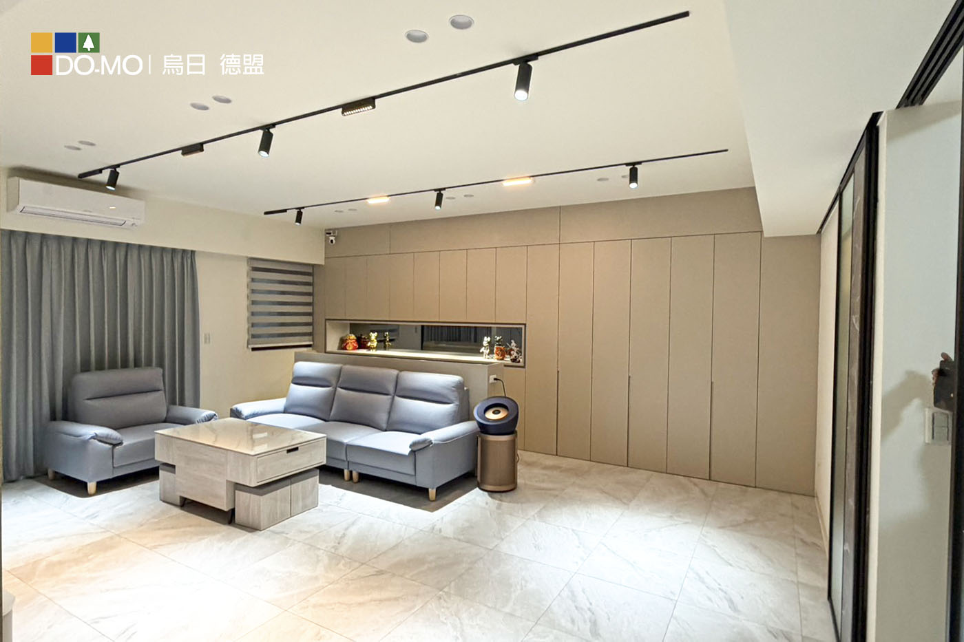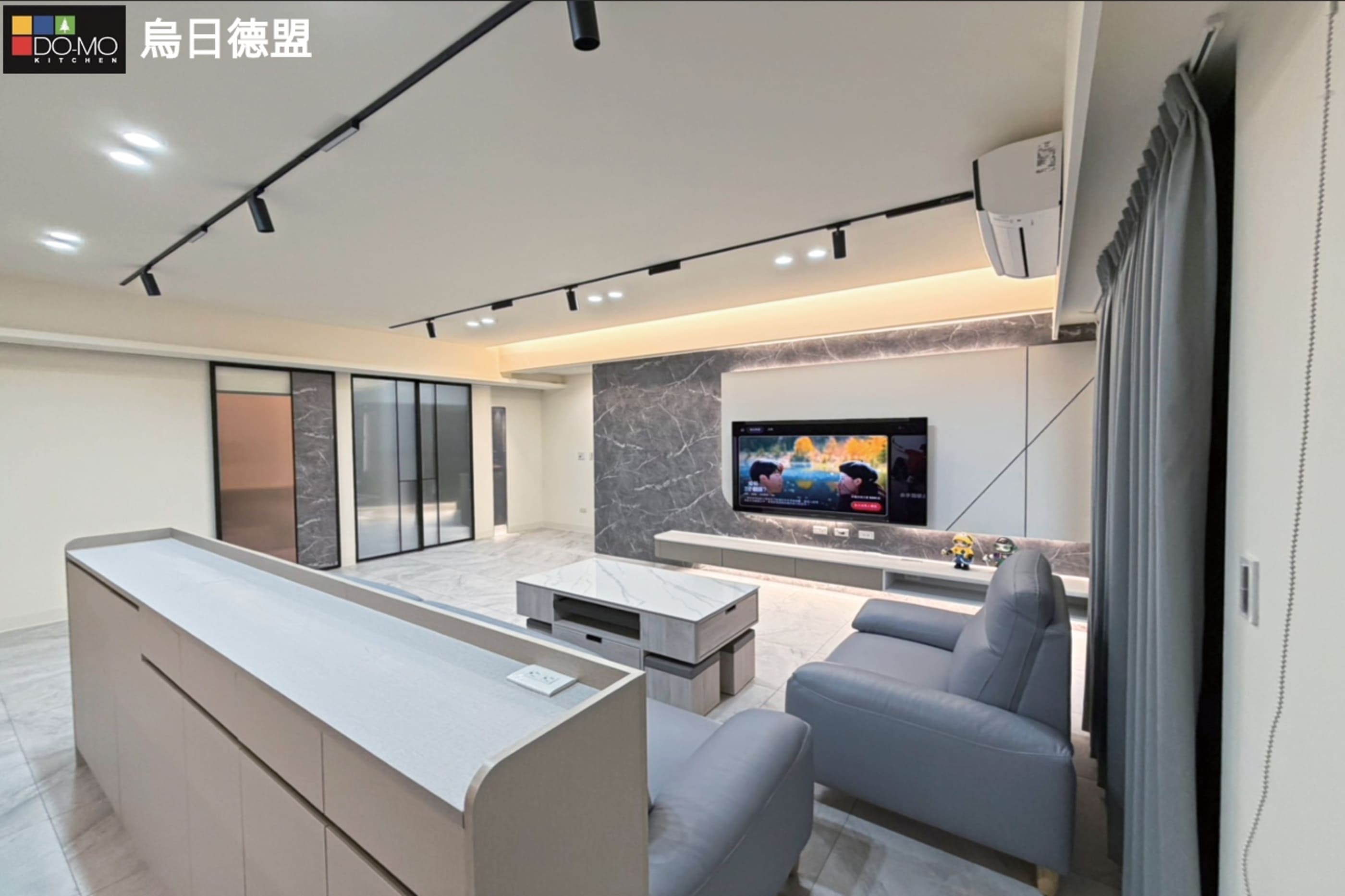 客廳運用沉穩灰調與石紋質材,營造低調優雅的空間氛圍。整體格局精心 規劃,大量隱藏式收納與系統櫃設計,大幅提升收納機能與整潔度。 兼顧美感與實用性,打造舒適、寬敞且富有質感的理想居所。 玄關 利用挑高鞋櫃將樑隱藏並增加收納量,以玻璃及燈光讓整體氛圍更多元。