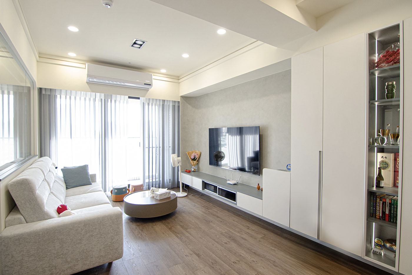客廳是家庭生活的核心,利用自然光線與異材質結合,創造開闊的視野。大型電視牆收納區採用懸空式底櫃,降低沉重感,也方便掃地機器人運作。電視牆則選用淺灰色調司曼特漆,注入自然的暈染質感。收納櫃則採用隱藏式把手,讓零散的線條消失,回歸簡潔。