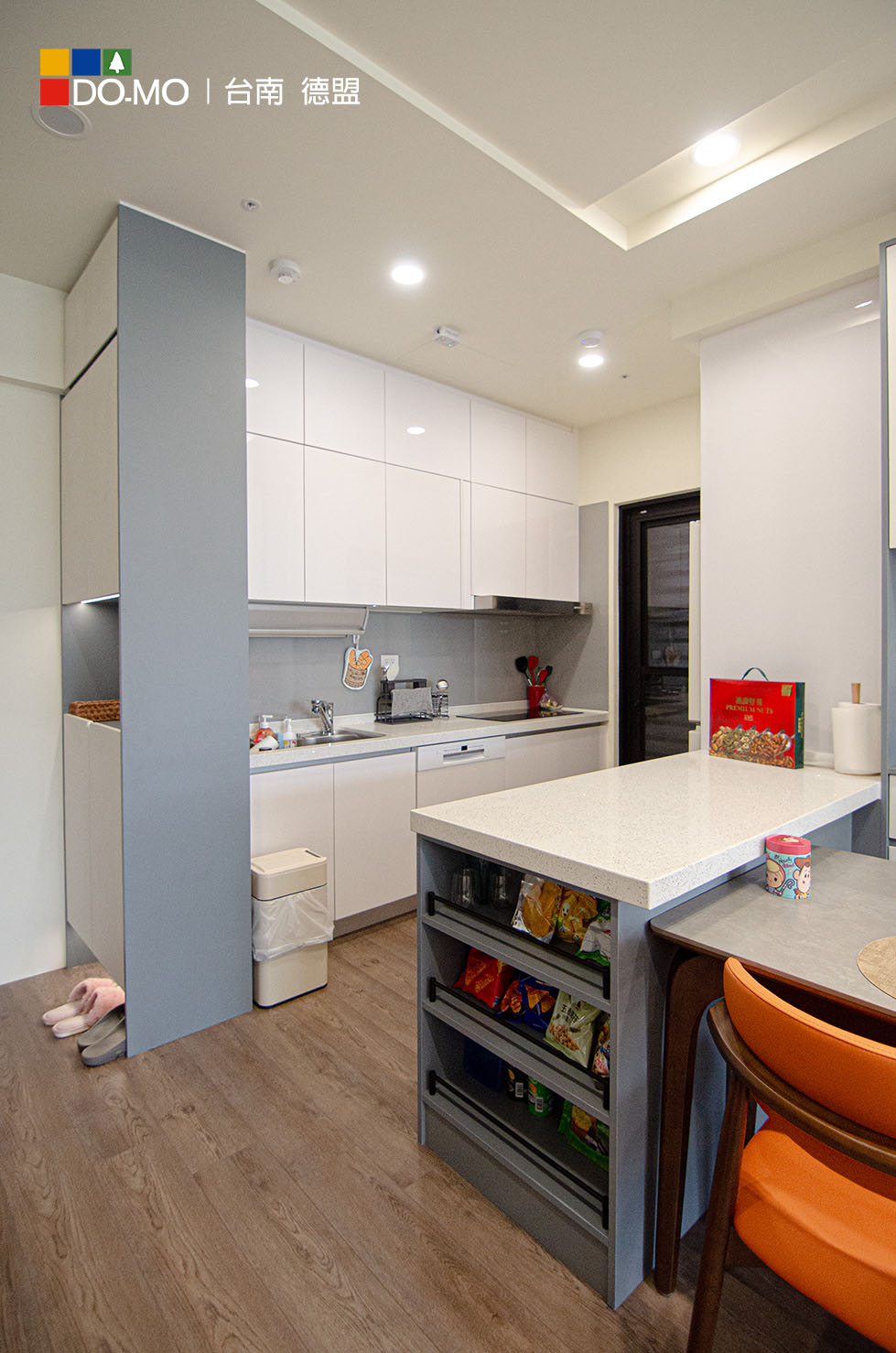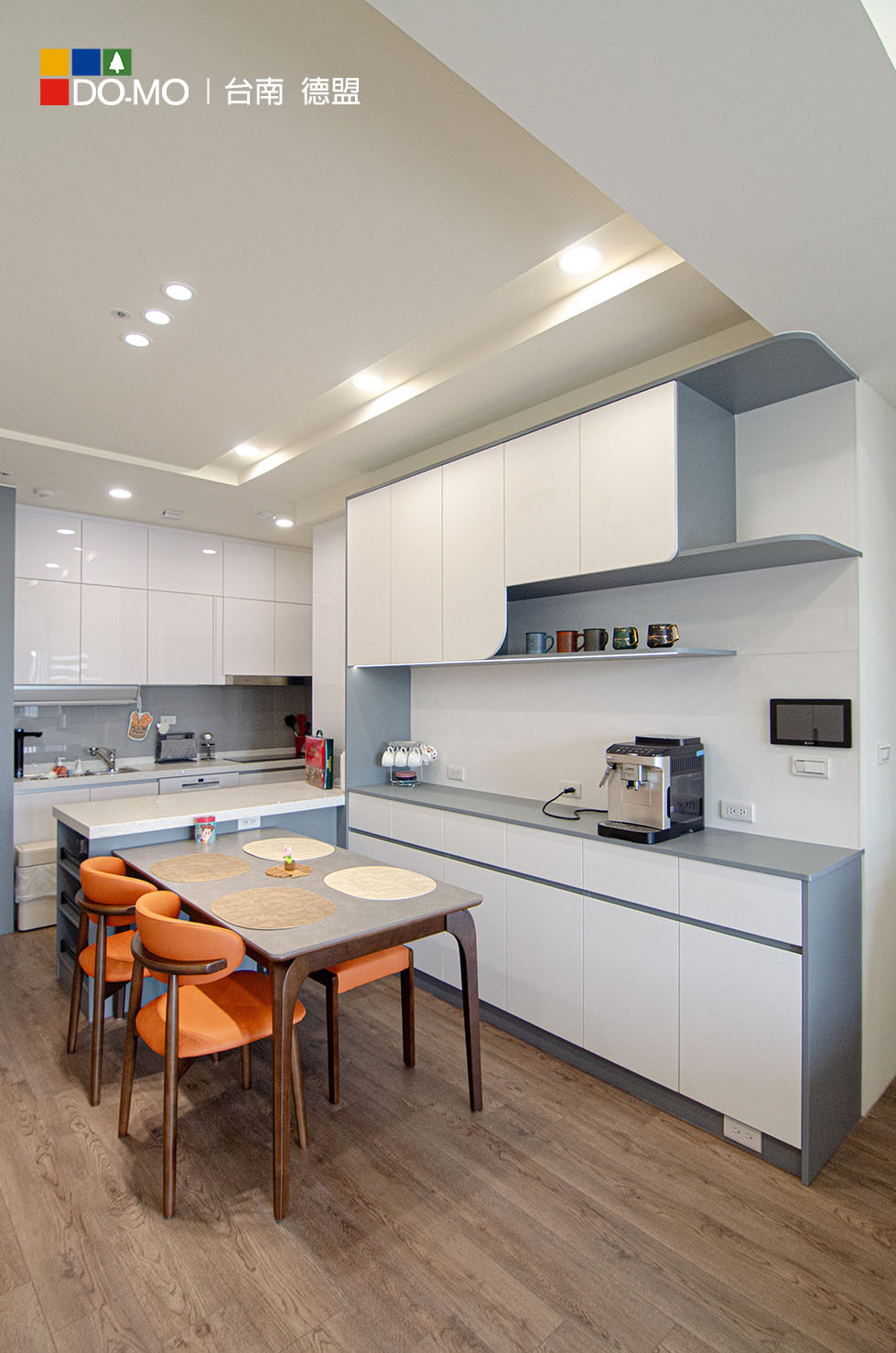 整牆式的系統電器櫃,寬闊的檯面提升使用彈性,半開放的檯面亦可作為茶水區使用。中島亦是補足廚具區收納不足的缺點,方便使用者歸納收整電器用品。