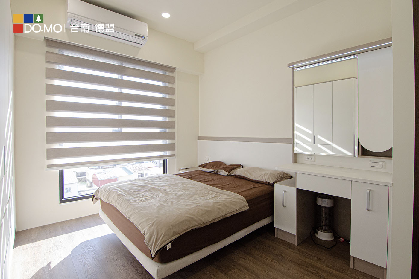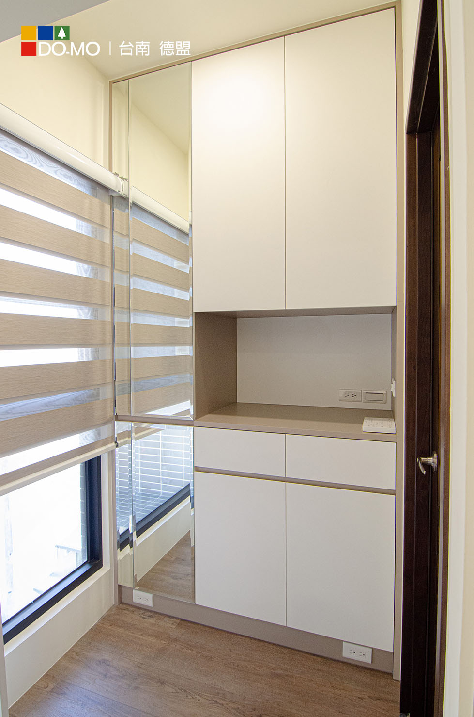 主臥室採用一字型頂天衣櫃,隱藏門把簡化線條,並在衛浴旁的畸零一角規劃穿衣鏡與半開放置物收納櫃,更加方便出入衛浴的梳洗使用。