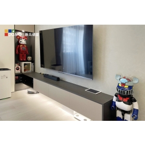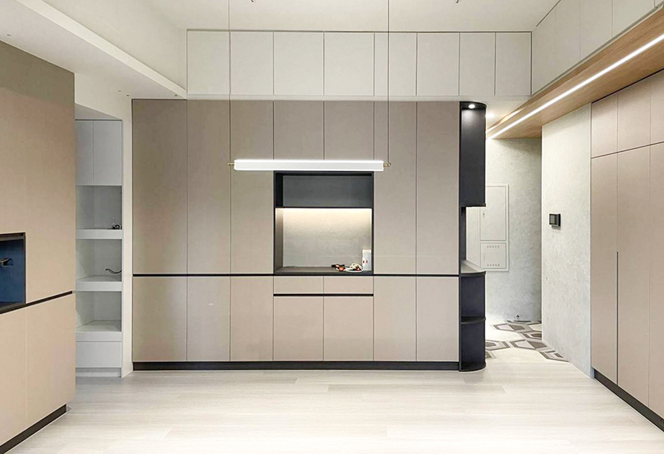以功能為主的半開放式空間,規劃了大面積的收納空間,讓再多的收藏和生活雜物都可以通通隱藏在櫃內,在規劃上也儘量簡化櫥櫃線條,不過度的修飾,讓空間的主角回歸於人。