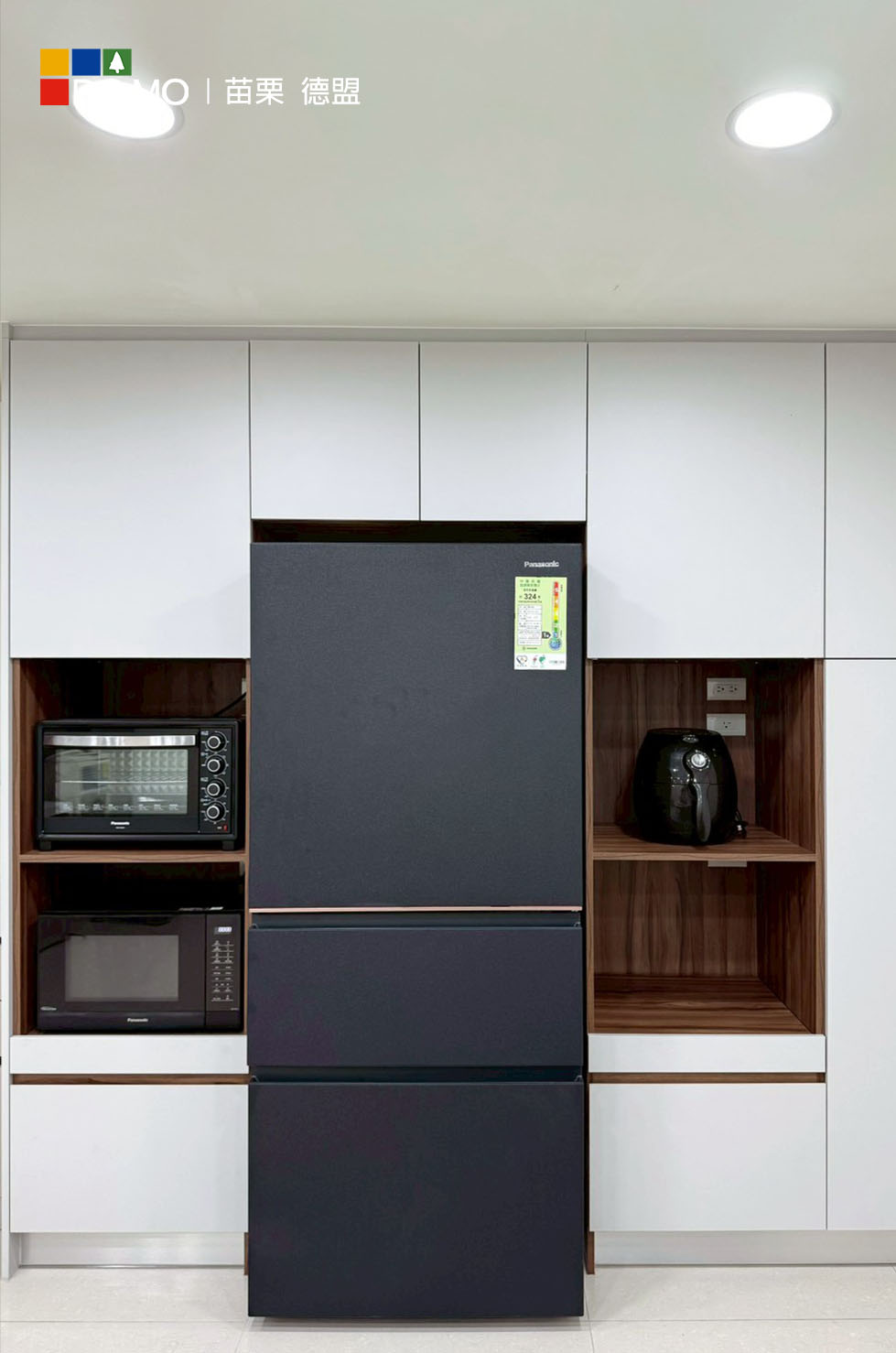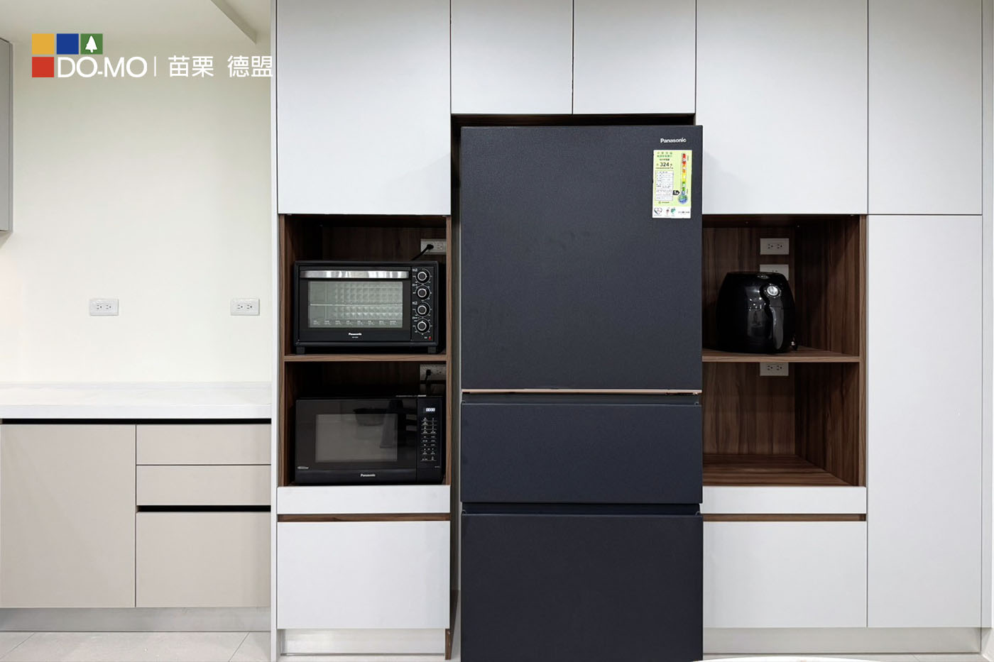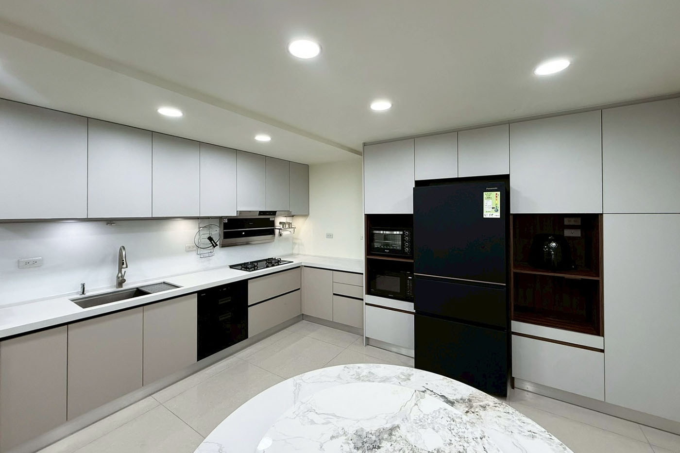深色冰箱作為視覺重點,平衡整體色調,增添一抹沉穩層次。