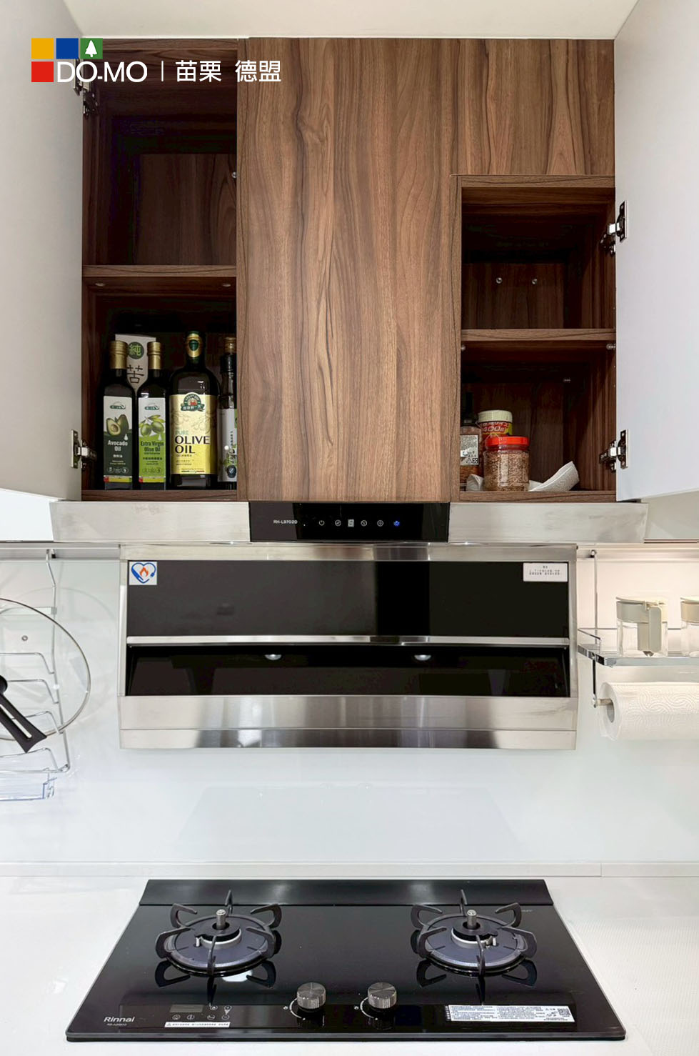 主要建材:檯面AbleStone石英石、歐洲進口塑合板、廚房伸縮龍頭、Rinnai 排油煙機、HAFELE鋁抽.blum緩衝鉸鍊