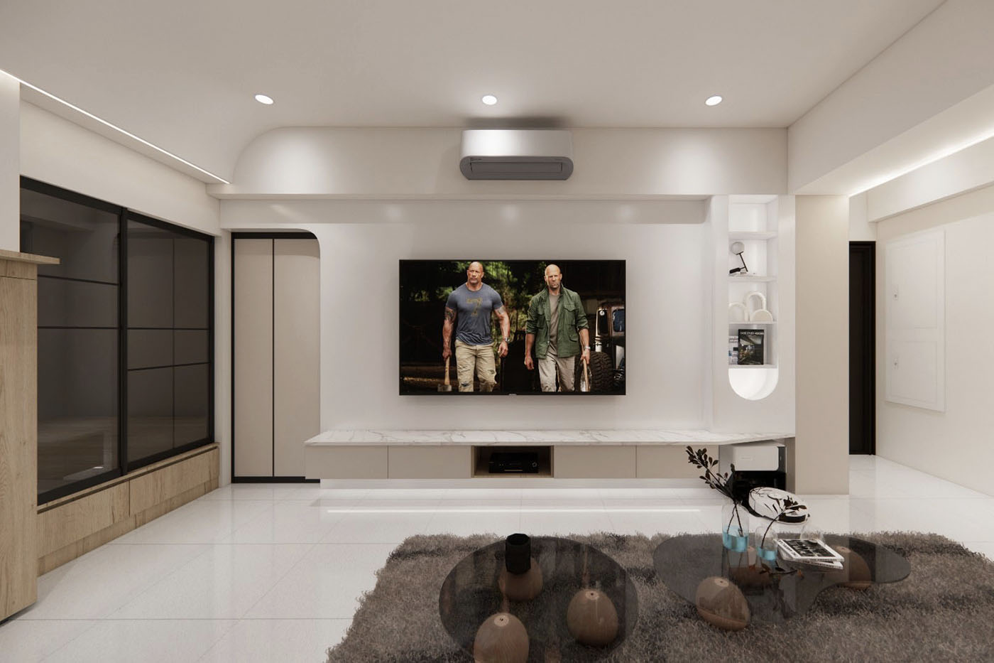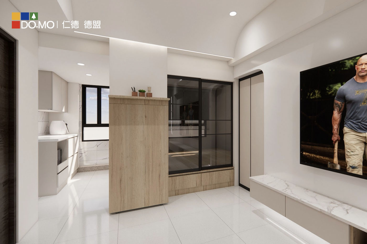 公領域中可見大面積留白,僅用局部圓弧修飾,以及輕淺溫柔的奶茶色作跳色點綴。電視牆面僅是在右側施作圓弧形造型開放櫃,左側的門框也順應優雅風格,修飾為弧形,留出的空白區塊讓空間有了舒適、寬敞的餘裕。