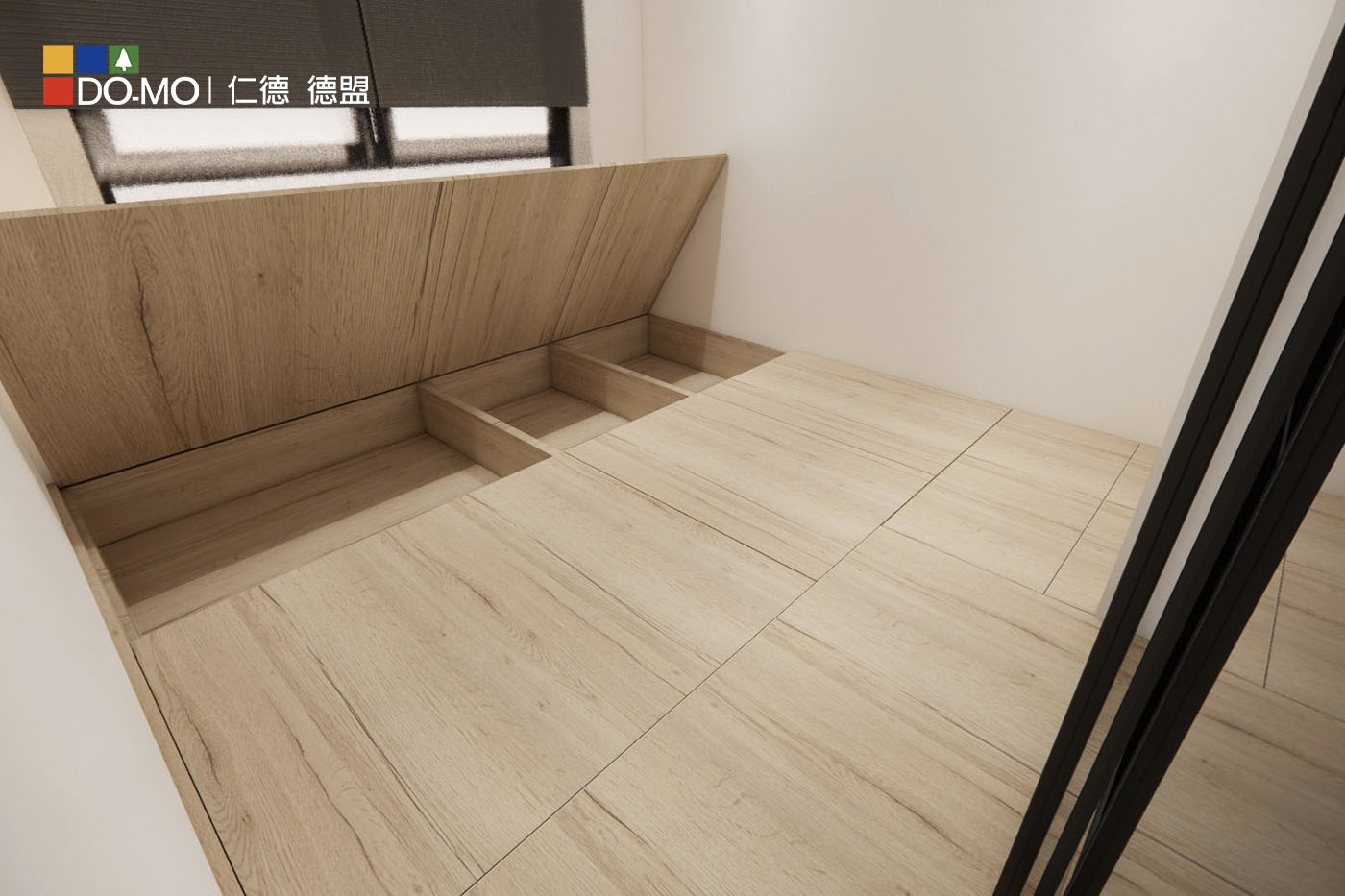 電視牆左邊的空間較小,作為臥室稍嫌勉強,於是便施作架高木地板作為和室使用,架高的空間底部也可做收納應用,相當彈性。